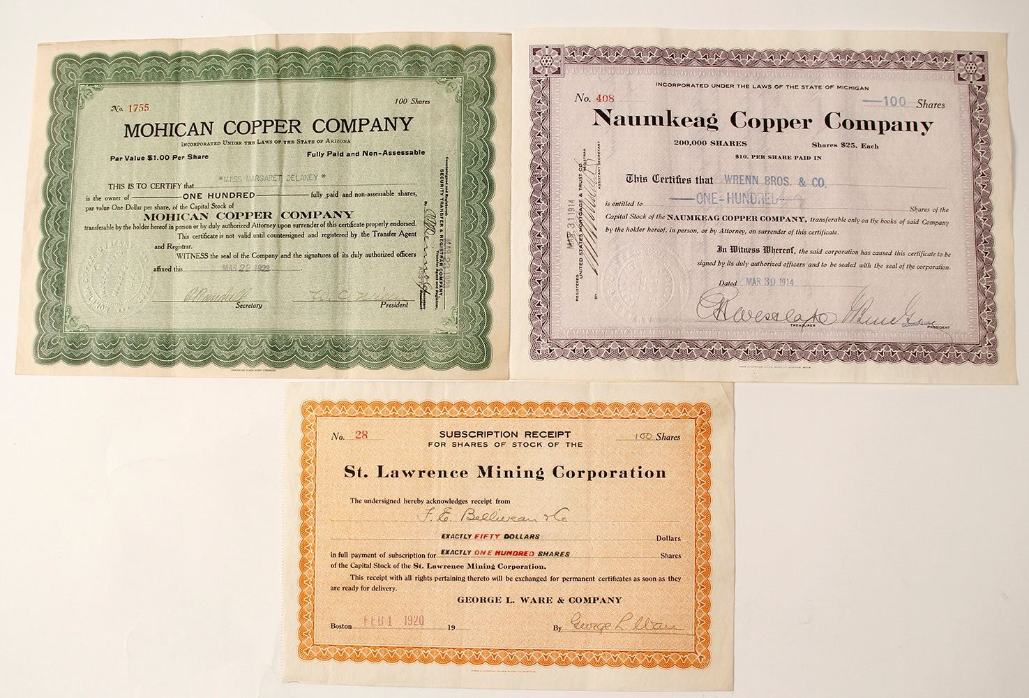 1) Naumkeag Copper Company. Issued 1914 for 100 shares to Wrenn Bros. & Co. Not cancelled. Purple border and background. 2) St. Lawrence Mining Corporation. Issued 1920 for 100 shares. Not cancelled. Orange background and border. 3) Mohican Copper Company. Issued in 1923 for 100 shares. Not cancelled. Green border and background. General good condition for group with folds, wrinkles and some soiling. (Prag Collection) Date: 1914-1923 Location: Michigan HWAC# 55426