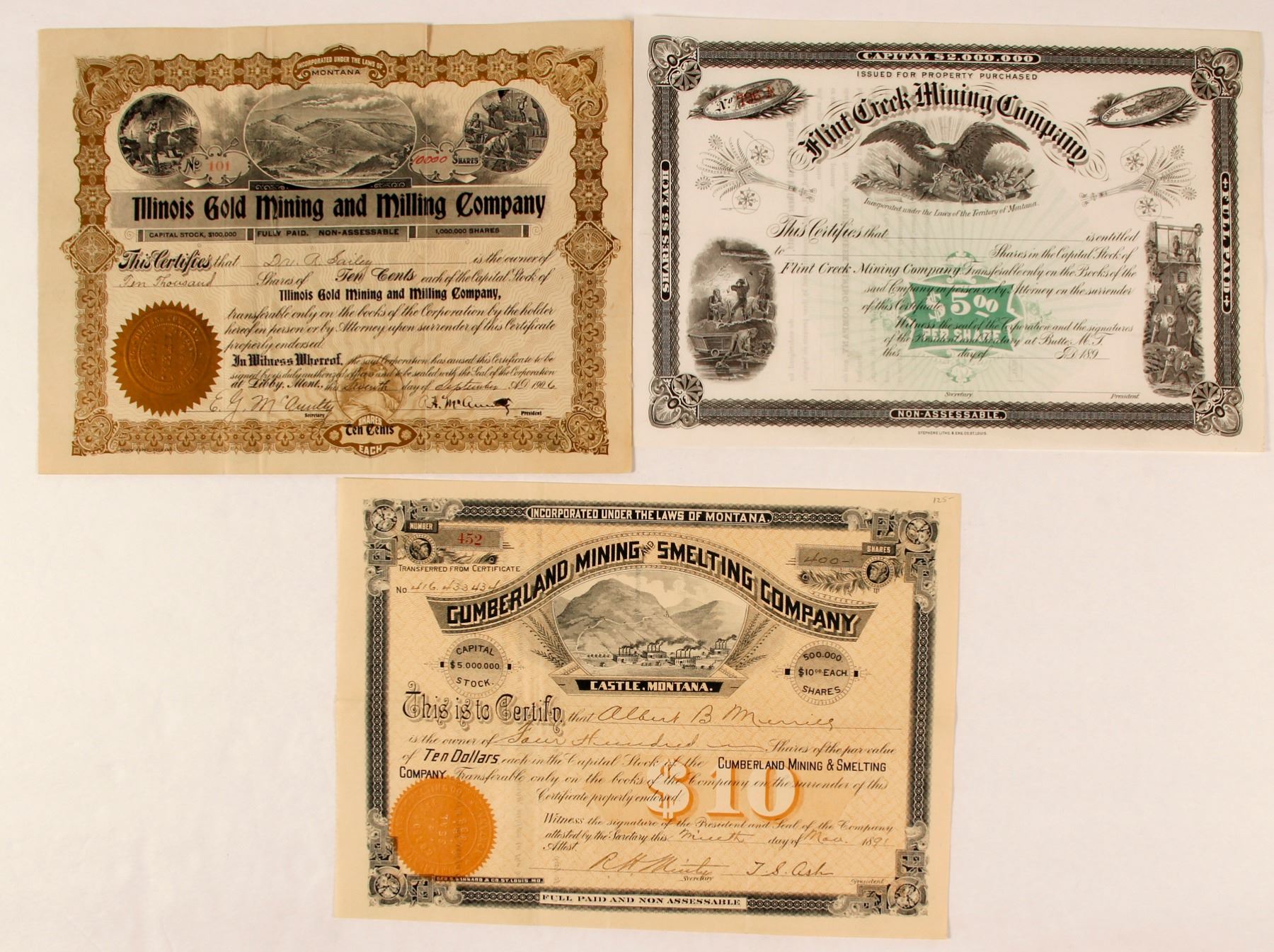 1) Cumberland Mining & Smelting Company. Castle, Montana. Issued in 1891, not cancelled. Mine vignette. Folds, very fine. 2) Illinois Gold Mining & Milling Company. Issued in 1906 in Libby, Montana. Not cancelled. Three mining vignettes. Folds with separation. 3) Flint Creek Mining Company. Butte, Montana Territory dateline. Unissued. c.1890s. Two mining vignettes and one of an eagle. Very fine. State: Montana Al Adams Collection. Date: 1891-1906 HWAC# 59073