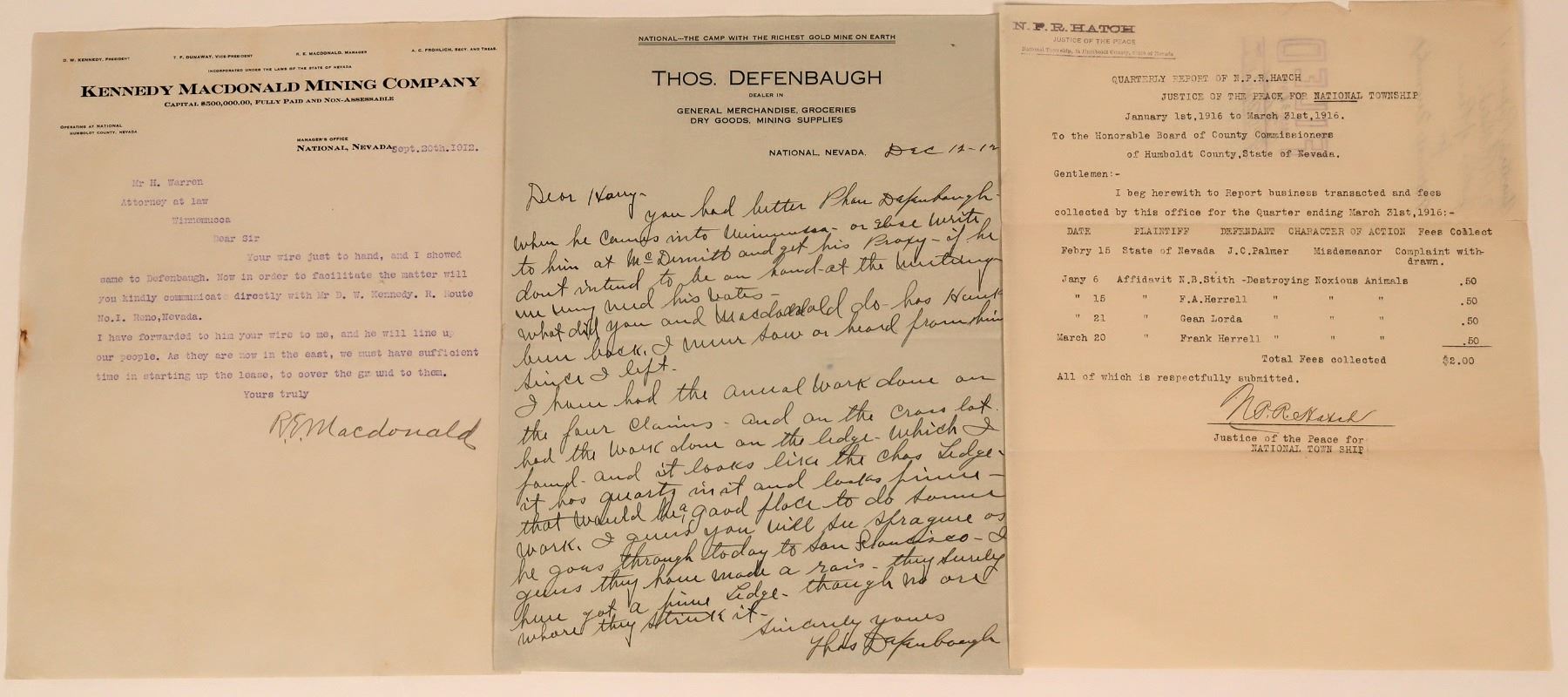 1) 1912 Thos. Defenbaugh general merchandise. Talks about proxies, annual work, etc. References McDonald. Probably referring to the Kennedy MacDonald Mining Company - see nest item. 2) Kennedy McDonald Mining Company. 1912. Letter written by RE McDonald to lawyer in Winnemucca references Defenbaugh. 3) Quarterly report from NPR Hatch, Justice of the Peace for the National township. About fees collected for destroying noxious animals.