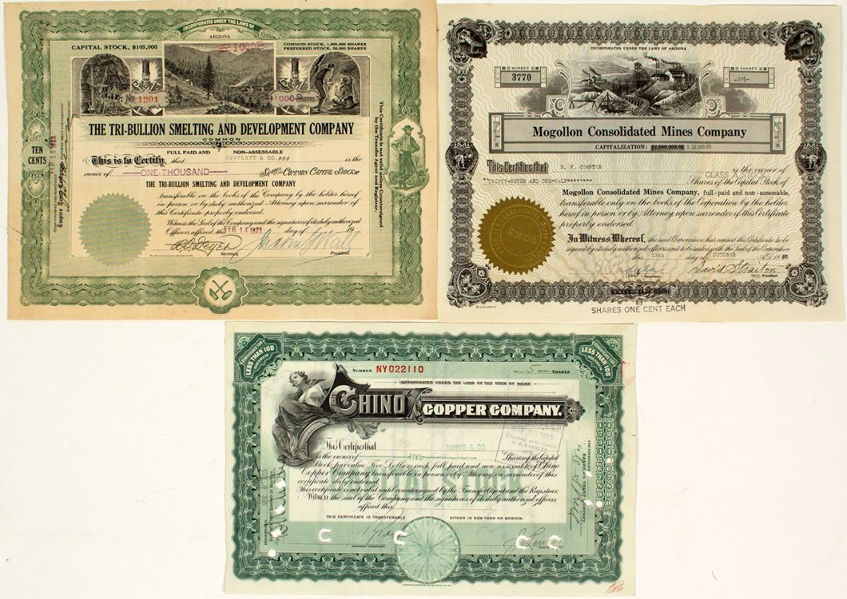 1) Chino Copper Company. No. NY022110, issued for 5 shares in 1915. Punch cancelled thru corporate signatures. Allegorical woman vignette and ornate logo. 2) Mogollon Consolidated Mines Company. No. 3770, issued for 37.5 shares in 1938. Not cancelled. Nice vignette of mine and smelter as well as mining vignettes in border. Pinholes, folds. 3) The Tri-Bullion Smelting and Development Company. No. 1201, issued for 1,000 shares in 19123. Not cancelled. Ornate certificate with vignettes of mining tools incorporated with underground and surface vignettes. Design not often seen. Folds, toning, paper clip indent. State: New Mexico City: Date: 1915-1938 FHWAC#: 42167