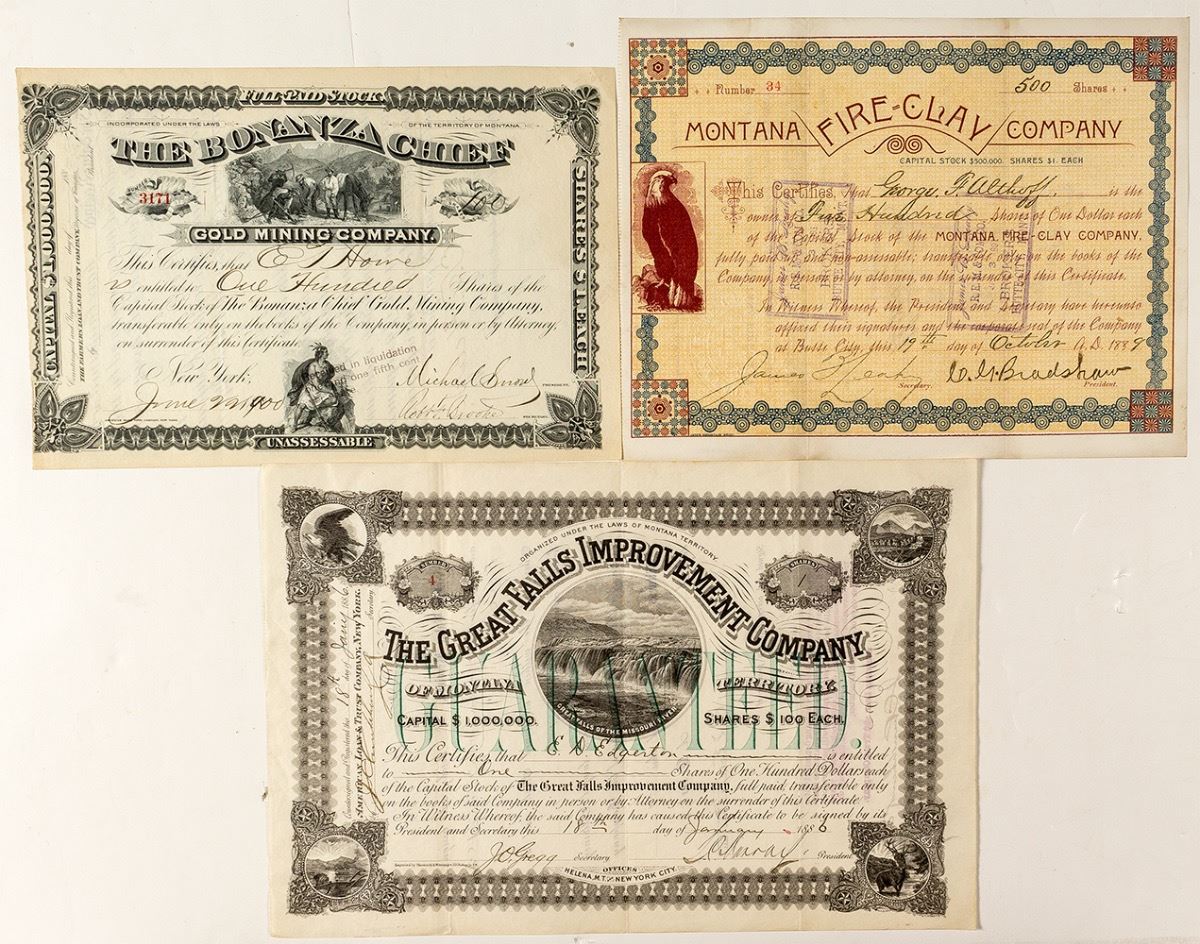 Three in nice condition. 1) Montana Fire-Clay Company. Butte City. No. 34, issued 1889. Stamp cancelled. Colorful stock with eagle vignette. 7.75" x 10.25" 2) The Bonanza Chief Gold Mining Company. No. 3171, issued for 100 shares in 1901. Received in liquidation. Prospector vignette and Native American vignette. 7" x 10.5" 3) The Great Falls Improvement Company. Low No. 4, issued for 1 share in 1886. Not cancelled. Very attractive cert. with waterfall vignette and smaller corner vignettes. 8.5" x 12.5" City: State: Montana Date: 1886-1901 ID: 36605