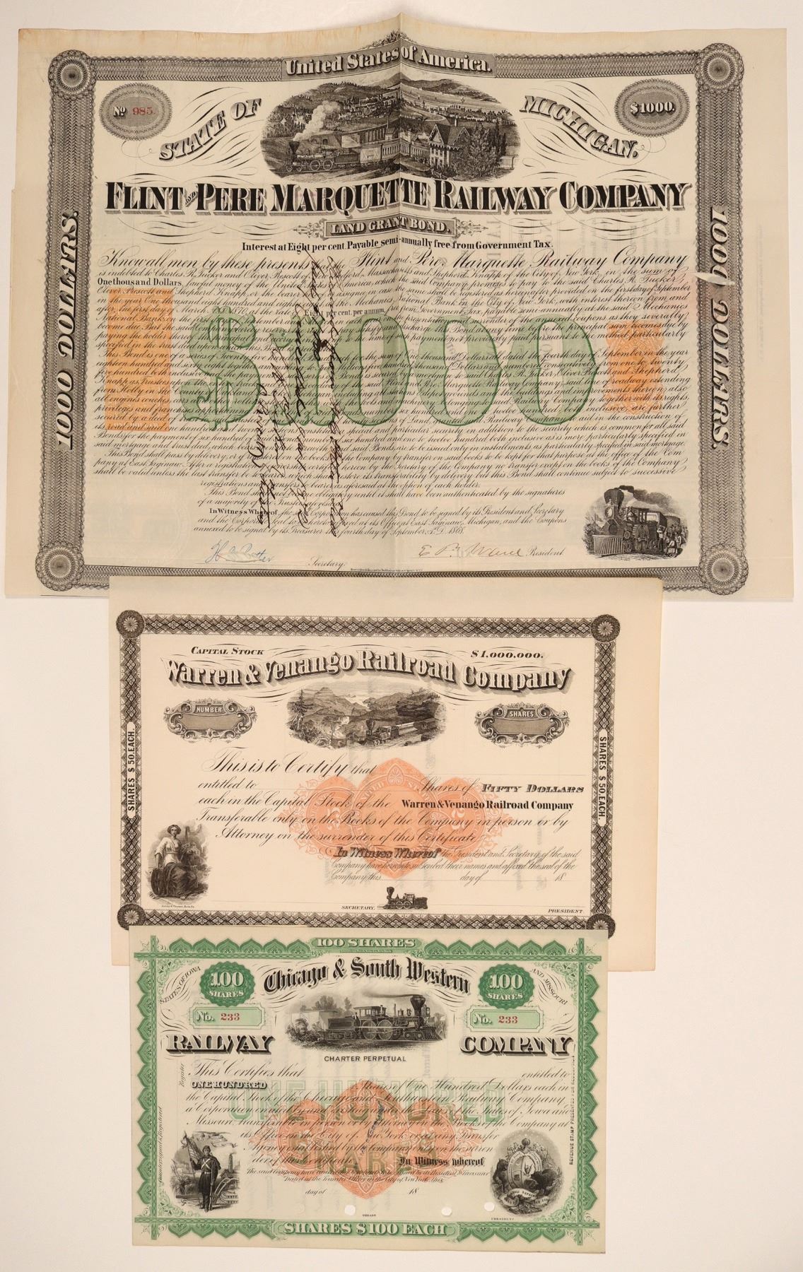 Lot of 3 different. 1) Warren & Venango Railroad Company. Unissued stock. Three vignettes (two railroad, one allegorical). RN-U revenue imprint. 2) Chicago & South Western Railway Company. One unissued stock. Green border, black print, and 3 vignettes (railroad, Civil War soldier, and state seal). RN-U1 imprinted revenue. Punch cancelled. 3) Flint & Pere Marquette Railway Company. $1,000 bond issued in 1868, pen and cut cancelled. Two railroad vignettes and three imprinted revenue stamps: RN-P5 (front and back) and RN-W2.