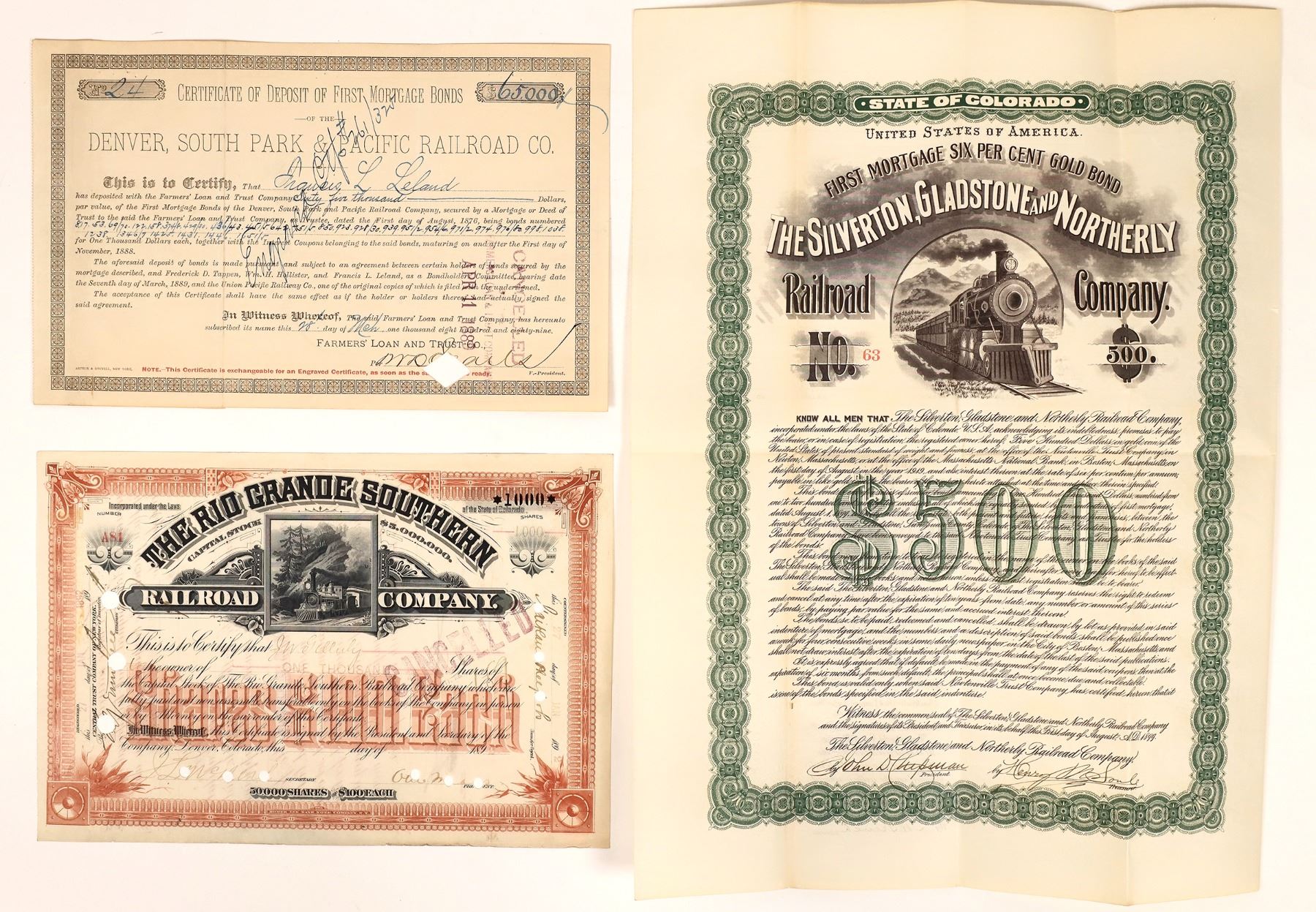 Lot of 3 different. 1) Rio Grande Southern Railroad Company. Inc. in Colorado. No. A81, issued for 1,000 shares in 1892. Signed by Otto Mears as president and JL McAerl as secretary. Signatures heavily punch cancelled. Red border, black print, and nice locomotive vignette. Otto Mears, "Pathfinder of the San Juans," was a central railroad and mining figure in Colorado's history. This railroad operated between Durango and Ridgway, Colorado. 2) Certificate of Deposit of First Mortgage Bonds for the Denver, South Park & Pacific Railroad Co. No. 24, issued for $65,000 to Francis Leland in 1889. Signed by the vice president (cut cancelled). Operated 1872 to 1889, when it was sold to the Denver, Leadville and Gunnison Railway. The line ultimately extended from Denver to the Baldwin/Caselton areas near Gunnison. From Denver, it went up the valley of the South Platte River to South Platte, then to Buffalo Creek & Bailey to Como through South Park to Garo, Fairplay and Alma. DSP& P built their own line into Leadville, crossing the Continental Divide twice. 3) Silverton, Gladstone & Northerly Railroad Company. Bond no. 63, issued for $500 in 1899. Signed by the president and treasurer. Not cancelled. 10 coupons attached. Green border and nice large locomotive vignette. Chartered in 1899 by the Gold King Mining Co. to haul ore from the mines on Cement Creek to the Silverton smelters. Otto Mears and his associates had been unable to secure money to build a branch of the Silverton Northern Railroad to the mining area around the town of Gladstone. The line ran from the mainline of the Silverton Northern on the north side of Silverton, followed Cement Creek northward, and reached Gladstone, 7.5 miles. It was leased by the Silverton Northern in 1910 and absorbed by them in 1915. Dismantled between 1938 and 1942.
