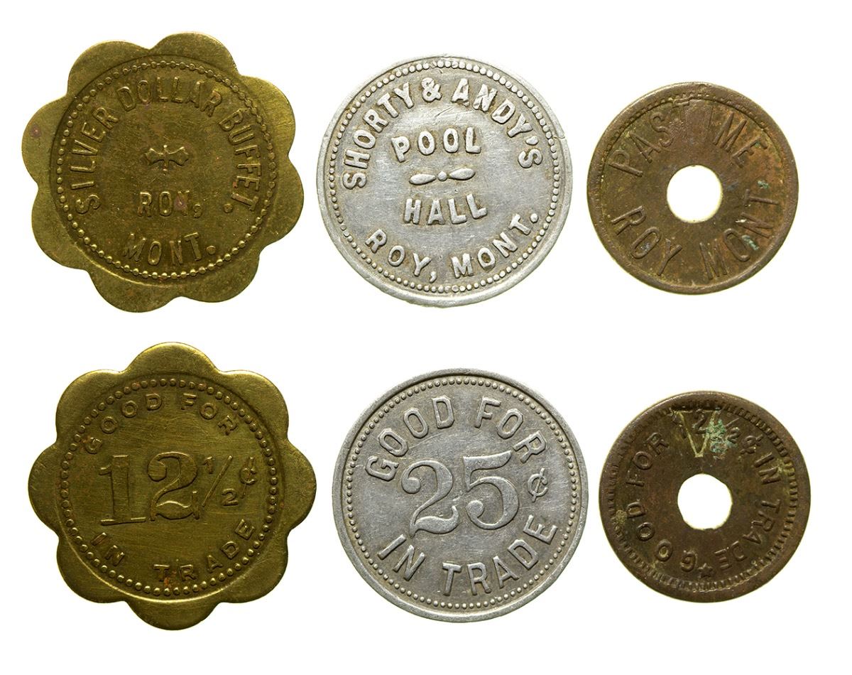 1) Shorty & Andy's / Pool / Hall / Roy, Mont. // GF / 25c / IT. Round, aluminum. 2) Pastime / Roy, Mont. // GF / 12-1/2c / IT. Round, brass, center hole. 3) Silver Dollar Buffet / Roy, / Mont. // GF / 12-1/2c / IT. Scalloped (8), brass. (Svoboda Collection) City: Roy State: Montana Date: HWAC# 35839