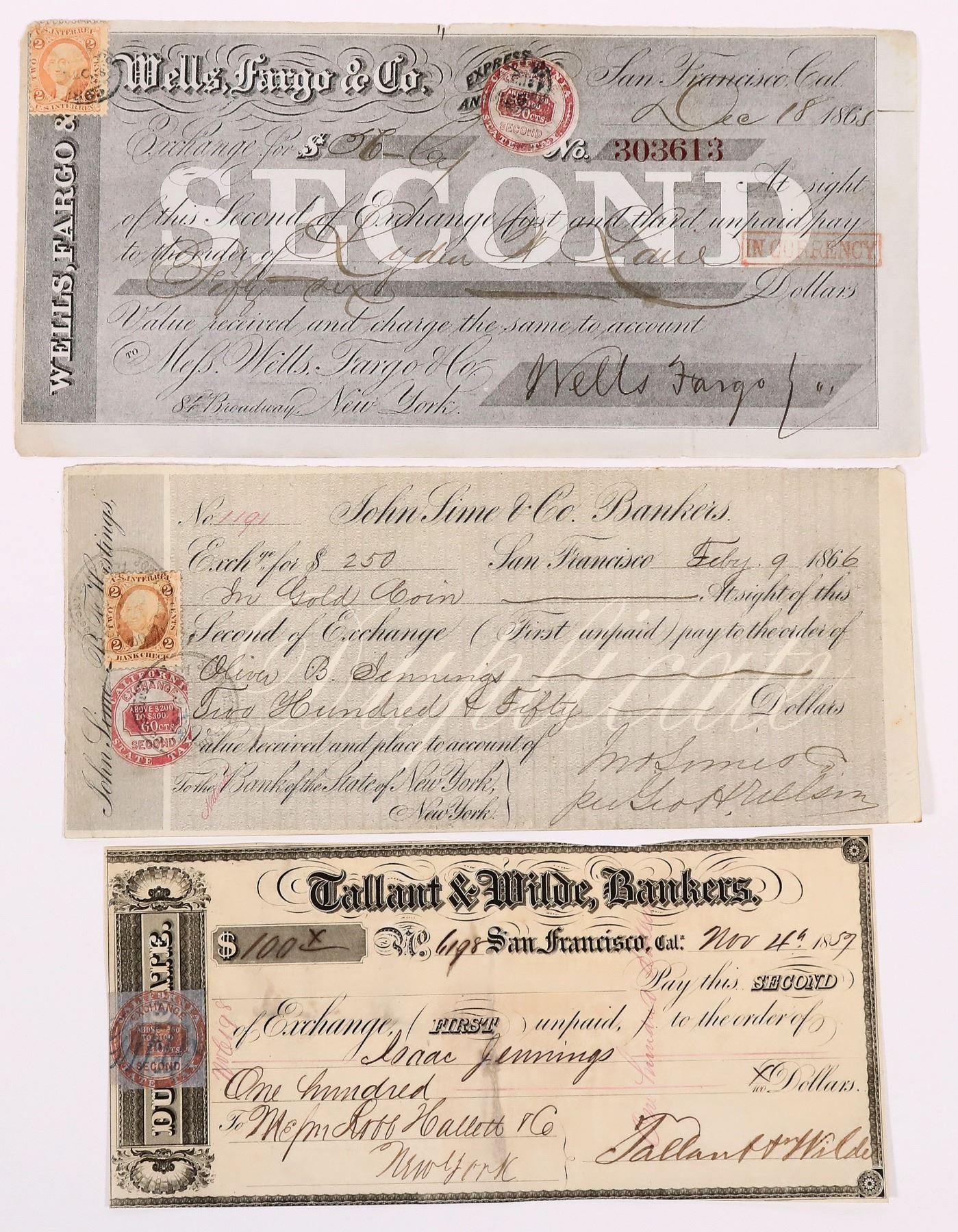 Lot of 3 different Seconds of Exchange, all with a California adhesive revenue stamp. 1) Tallant & Wilde, Bankers, Nov. 4th, 1857. Issued to Isaac Jennings for $100. 20 cent California State Tax stamp attached on the left. Tallant & Wilde established as a private bank in 1850 during the California Gold Rush. Wilde died in 1863 and John McKee, cashier, joined Tallant to become Tallant & Company. They incorporated as a state bank in 1891. 2) John Sime & Co. February 9th, 1866. Issued to Olivia B. Jennings for $250 to be paid in US gold coin. 60 cent California State Tax stamp and 2 cent US Bank Check stamp attached on the left. Sime came to California in 1849 during the Gold Rush. He began work in carpentering, and opened his banking house in 1856-57. He was very successful and invested in other industries such as the powder mills at Santa Cruz, woolen mills, and rope-walk. He died in 1871 at the age of 54 from something brain-related. After his death, there was a run on his bank that also caused the failing of BF Hastings & Co. bankers in Sacramento (Hastings was Sime's partner). Sime & Co. failed for over $200,000, according to Daily Alta California articles from November, 1871. 3) Wells Fargo & Co. Dec. 18, 1865. Issued to Lydia Lane for $50 to be paid in currency. 20 cent California State tax stamp and 2 cent US IR stamp attached.