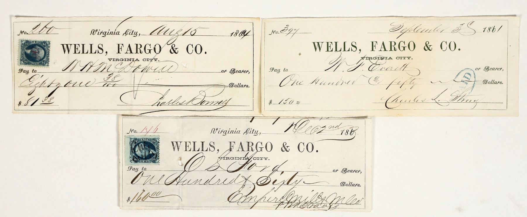 Lot of 3 different. Wells Fargo established a branch on the Comstock in 1860. 1) Very early Sept. 1861 check, green print, issued to WF Everett for $150. Signed by Charles Strong for the Gould & Curry. Strong was the first supt. of the company and presided over its disastrous expensive mill in 1863. He took his life in 1883. 2) Aug. 1864 check to McDowell signed by Charles Bonner as supt. for the Gould & Curry. 3) 1863 check to OS Ford signed by RN Graves as supt. for the Empire Mill & Mining Company.