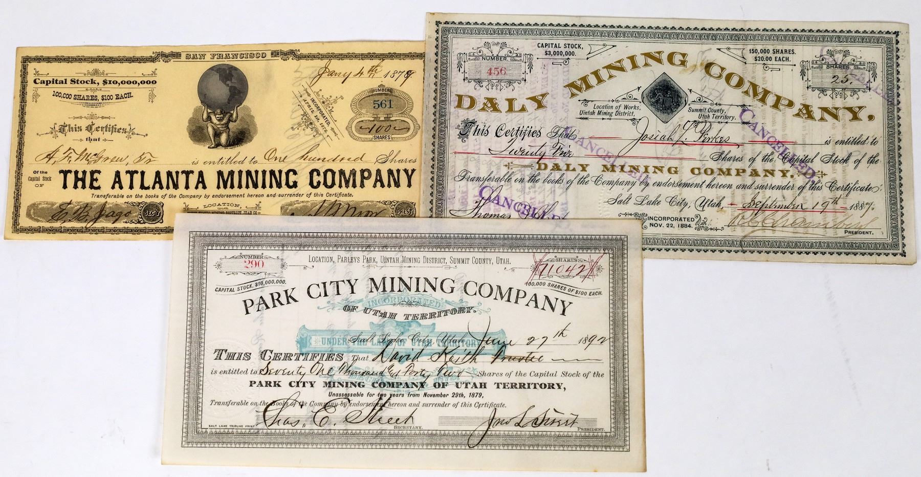 Lot of 3 different. 1) The Atlanta Mining Company. West Tintic Mining District. Issued in 1870 for 100 shares. Not cancelled. Great vignette of Atlas holding the world on his shoulder. Folds, wear to edges. 2) Daly Mining Company. Uintah Mining District, Summit County. Issued in 1887 for 25 shares. Stamp cancelled. Gold title and small vignette. Pinholes, folds, creases. 3) Park City Mining Company. Uintah Mining District. Issued in 1892 for 71,042 shares. Not cancelled. Pinholes, folds.