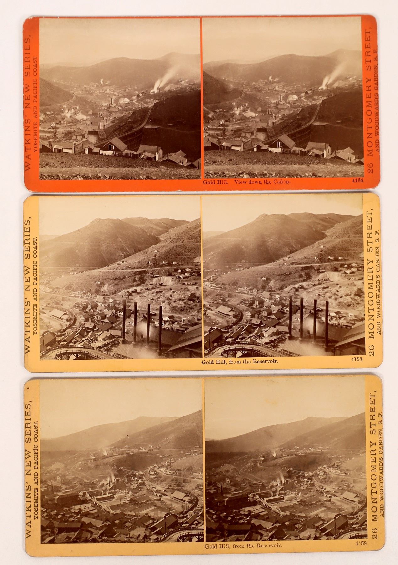 Lot of 3 different. All are bird's-eye views of Gold Hill from the reservoir. All are from Watkins' New Series, Yosemite and Pacific Coast, 26 Montgomery Street, and Woodward's Garden, S.F. (c.1876-79). Includes 4158 and 4159, "Gold Hill, from the Reservoir" and 4164 "Gold Hill. View down the Canon" (with Virginia & Truckee train trestle in view).Good contrast, sharp focus. Busy and crowded Gold Hill with many mines, miles, and other buildings visible.
