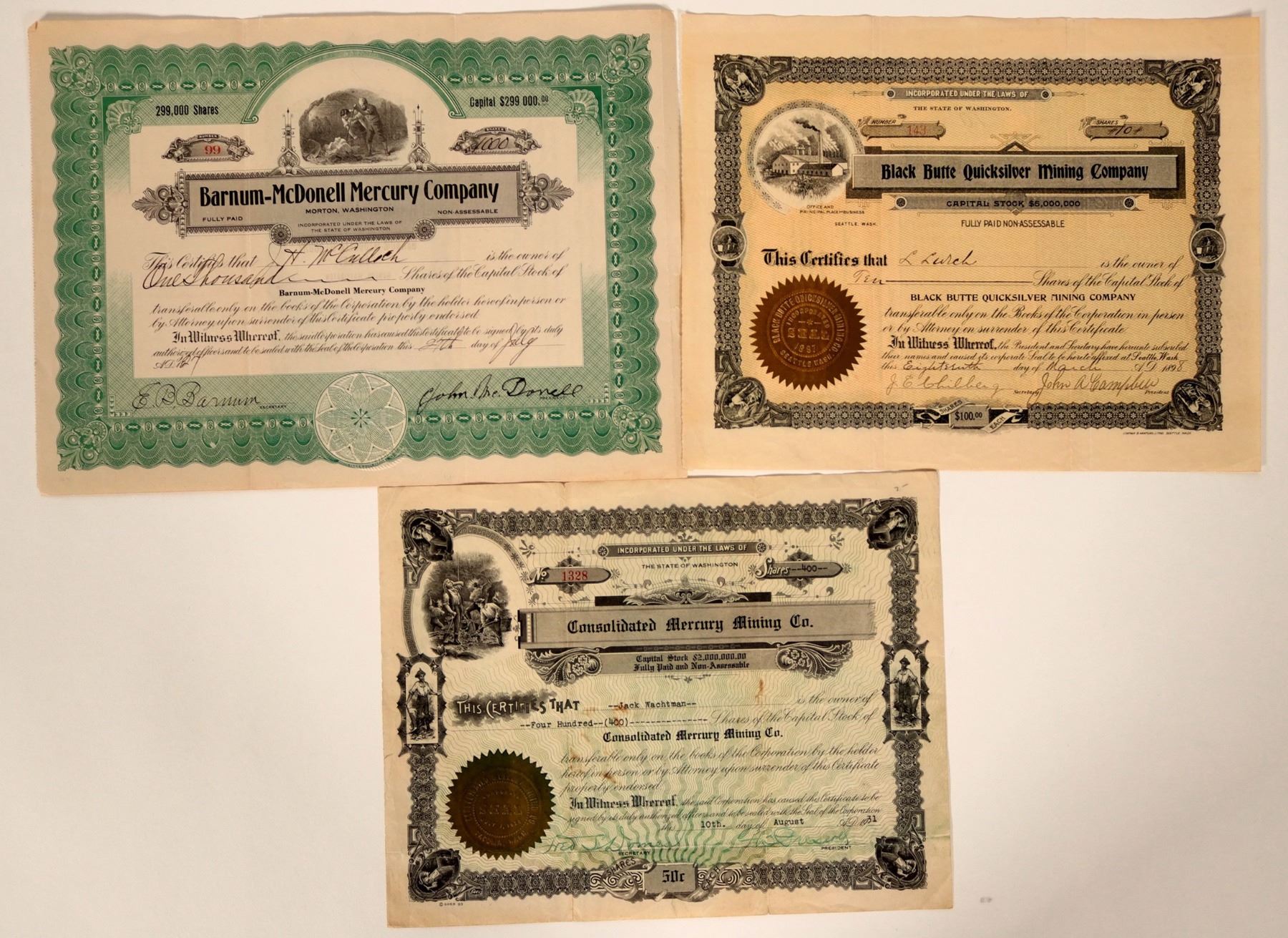 Lot of 3 different. 1) Black Butte Quicksilver Mining Company. Seattle. No. 143, issued for 10 shares in 1898. Not cancelled. Signed by president Campbell and secretary Chibberg. Mining vignettes. Heavy folds, creases. 2) Consolidated Mercury Mining Company. Tacoma. No. 1328, issued for 400 shares in 1931. Not cancelled. Mining vignettes. Deep folds, creases, and stains. 3) Barnum-McDonell Mercury Company. Morton. No. 99, issued for 1000 shares in 1927. Not cancelled. Signed by president McDonell and secretary Barnum. Mining vignette. Folds, creases, tear. City: State: Washington Date: 1898-1930