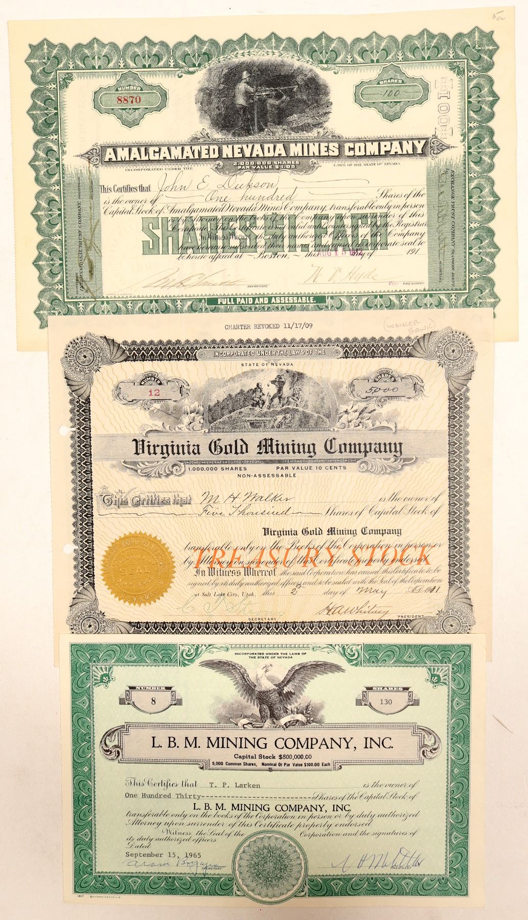 Lot of 3. 1) Virginia Gold Mining Company. Osceola. Issued in 1911 for 5,000 shares to MH Walker (Walker Bank in SLC). Punch cancelled. Mining vignette. 2) Amalgamated Nevada Mines Company. Black Horse. Issued in 1912. Not cancelled. Mining vignette. 3) LBM Mining Company, Inc. Little Bald Mt. between Ely and Elko. No. 8, issued in 1965. Not cancelled. Eagle vignette. Ken Prag Collection