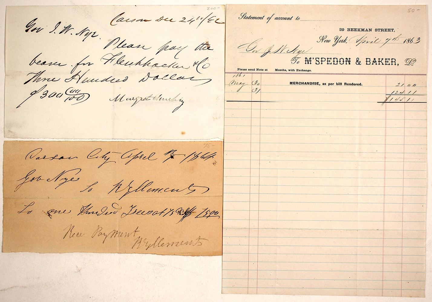 Lot of 3 for Governor James Nye: two handwritten notes dateline Carson 1862 & 1864 and one billhead for Nye from a New York merchant, 1863. James Nye was appointed by President Abraham Lincoln as governor of the newly created Nevada Territory in 1861. When Nevada became a state in 1864, he was elected as a Republican to the U.S. Senate; he was reelected in 1867 and served from February 1, 1865 to March 3, 1873. Date: 1862-1864 Location: Nevada HWAC# 53357