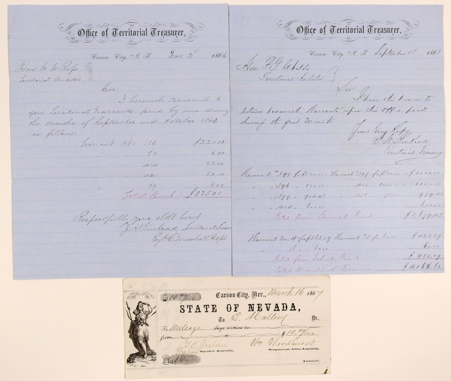 1-2) Two Territorial Correspondence between P Child (auditor) and JH Kinkead (treasurer). Relating to payment for various warrants. One signed by Kinkead. He would be Nevada's third Governor from 1879 to 1883 and Alaska's first governor of the newly formed District of Alaska in 1884. 3) 1867 warrant to E Mallory for mileage while serving in the Nevada Assembly. Signed by the Speaker, TV Julien and William Woodbury as Sergeant-at-Arms. Mallory was appointed judge of the newly formed Genoa District in Douglas County in January of 1862 by Territorial Governor Nye. Woodbury was a long time capital attorney and was said to exert a great amount of influence on who ran for office. Julien was the Humboldt Register editor and Humboldt County District Attorney. City: Carson City State: Nevada Date: 1863, 1867