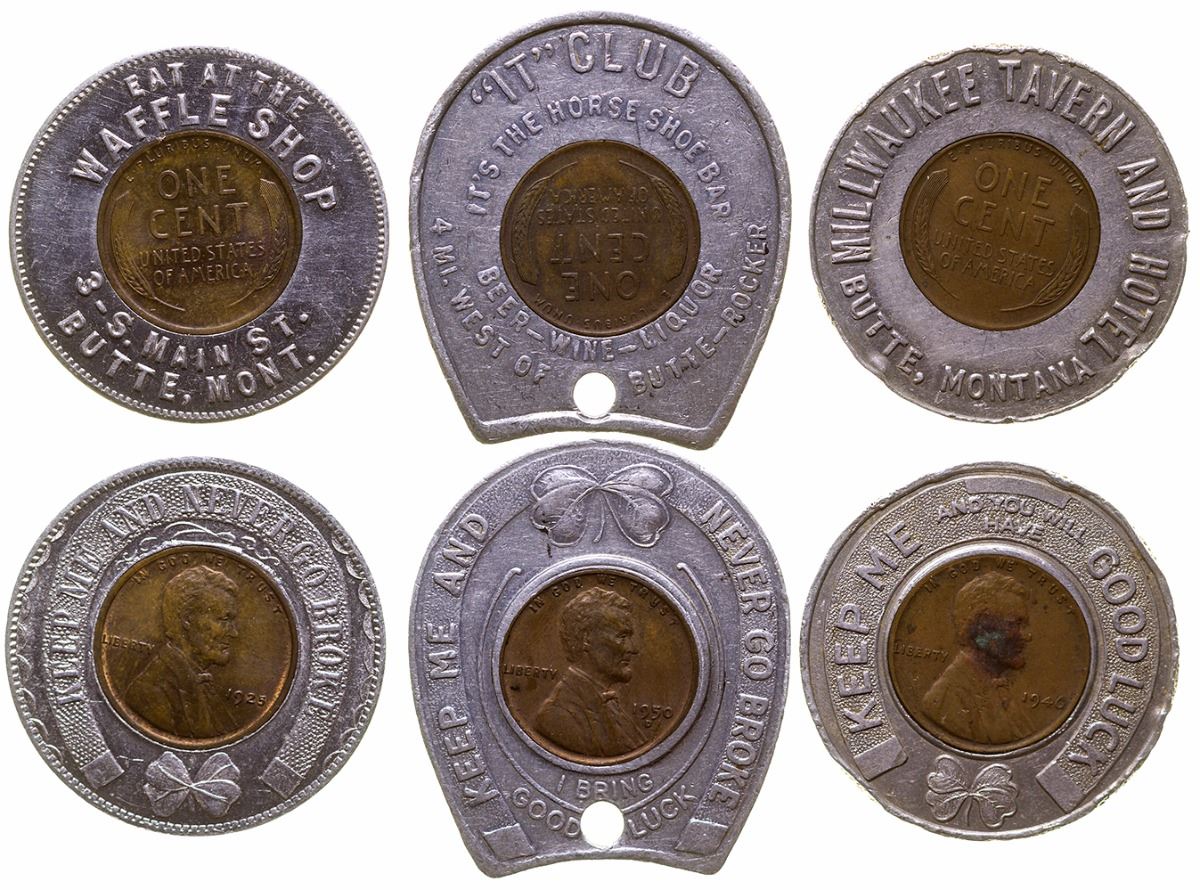 Three Lincoln encased pennies: Rocker Horse Shoe Bar, "It" Club; Millwaukee Tavern and Hotel; Waffle Shop. State: Montana City: Butte Date: FHWAC#: 41618