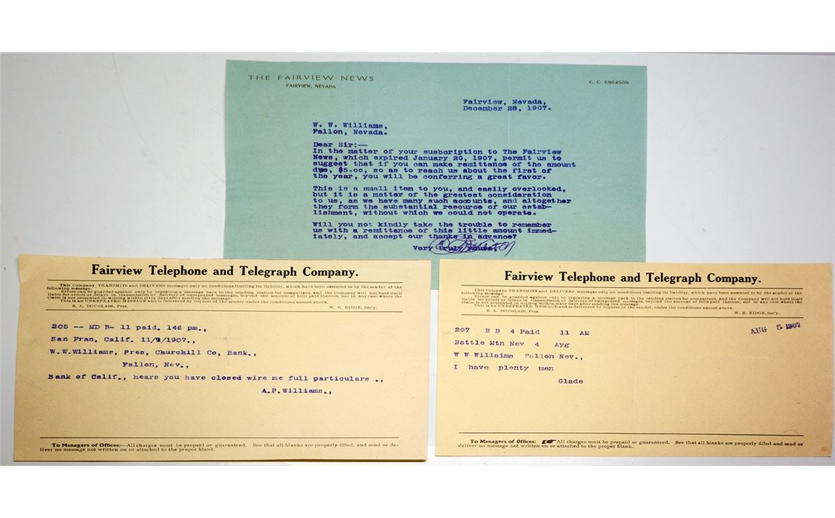 One Fairview News asking for payment. Two Fairview Telephone and Telegraph Company telegraphs. Both to W. W. Williams of Fallon. One from San Francisco says Bank of California hears you have closed. The other is from Battle Mountain and Glade says he has plenty of men.