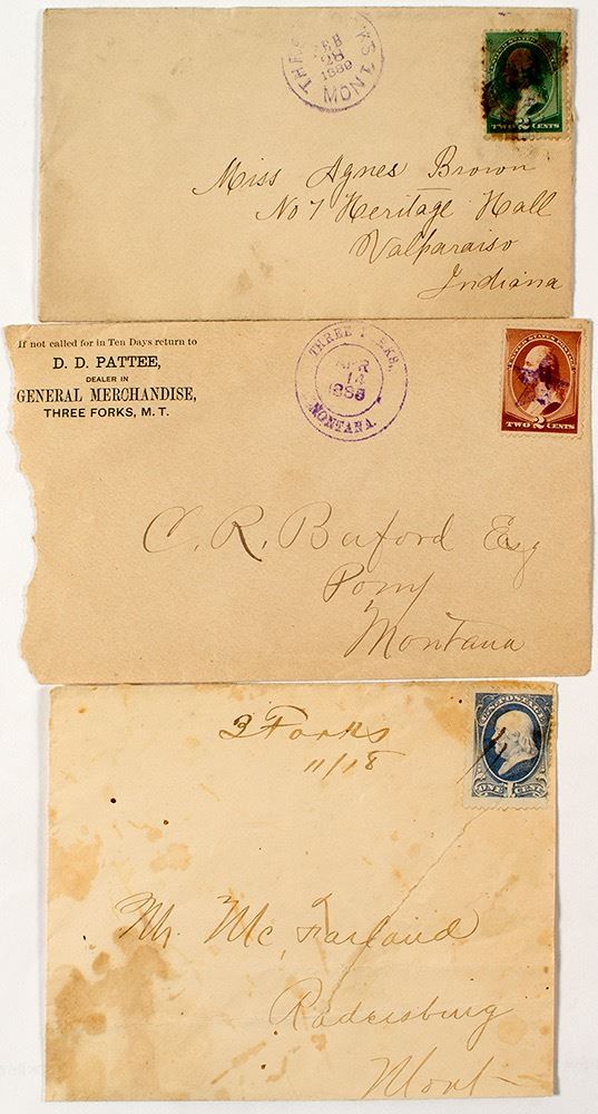 Lot of three. 1) #1 in Shellen & Dunn. manuscript. Four in census. 2) #2 in Shellen & Dunn. Five in census. Double Circle. Corner advertising for D. D. Pattee, General Merchandise. 3) New variety. February 28, 1889. City: Three Forks State: Montana Date: 1884-1889 ID: 36723