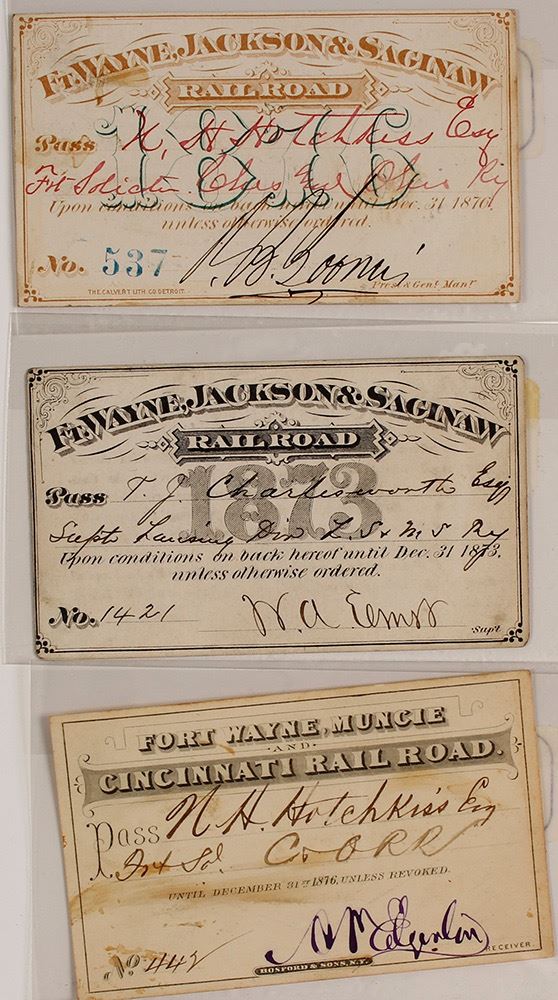 Three passes from two different Ft. Wayne railroads. 1) Fort Wayne, Muncie, & Cincinnati Railroad. Pass No. 442, issued to NH Hotchkiss for the year 1876. Paper and glue residue on the reverse. 2) Ft. Wayne, Jackson & Saginaw Railroad. Two passes, issued 1873 and 1876. One has paper and glue residue on the reverse. (Potter Collection) HWAC# 59965 Date: 1873-1876 Location: Ft. Wayne, Indiana