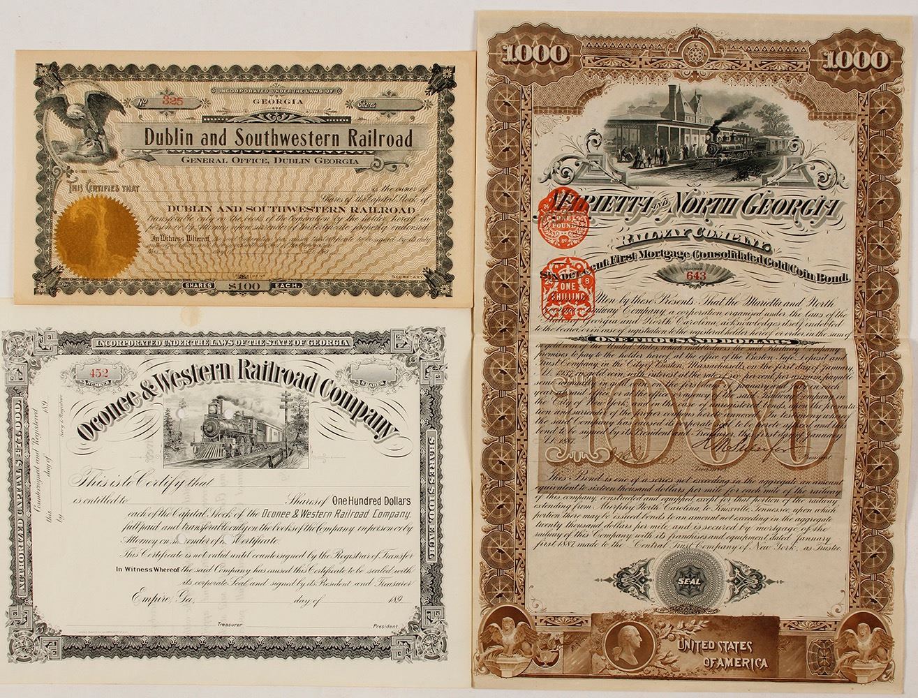 1) Marietta and North Georgia Railway Company stock. 1887. $1,000. Sold in England. English one pound and English one shilling imprinted. Number 643. Coupons 9 through 100 still attached. Vignette of train at station. Very nice condition. 2) Unused Oconee & Western Railroad Company. c189-. Punch cancelled. The Oconee & Western was organized in 1892 as successor to the Empire & Dublin Railroad which had constructed a 40-mile rail line from Dublin to Hawkinsville in 1889-90. 3) Unused Dublin and Southwestern Railroad. This company was only in existence from 1904 to 1907. Number 325. Interesting pictorial gold seal. Excellent condition. The Dublin & Southwestern was chartered in 1904 to build a railroad from Dublin southwest to Eastman and Abbeville. The road was completed to Eastman in mid-1905; it was never extended beyond that point. In 1907 the line was acquired by the Wrightsville and Tennille Railroad. (Al Adams Gold Rush Memorabilia Collection) Date: Location: Georgia HWAC# 58271