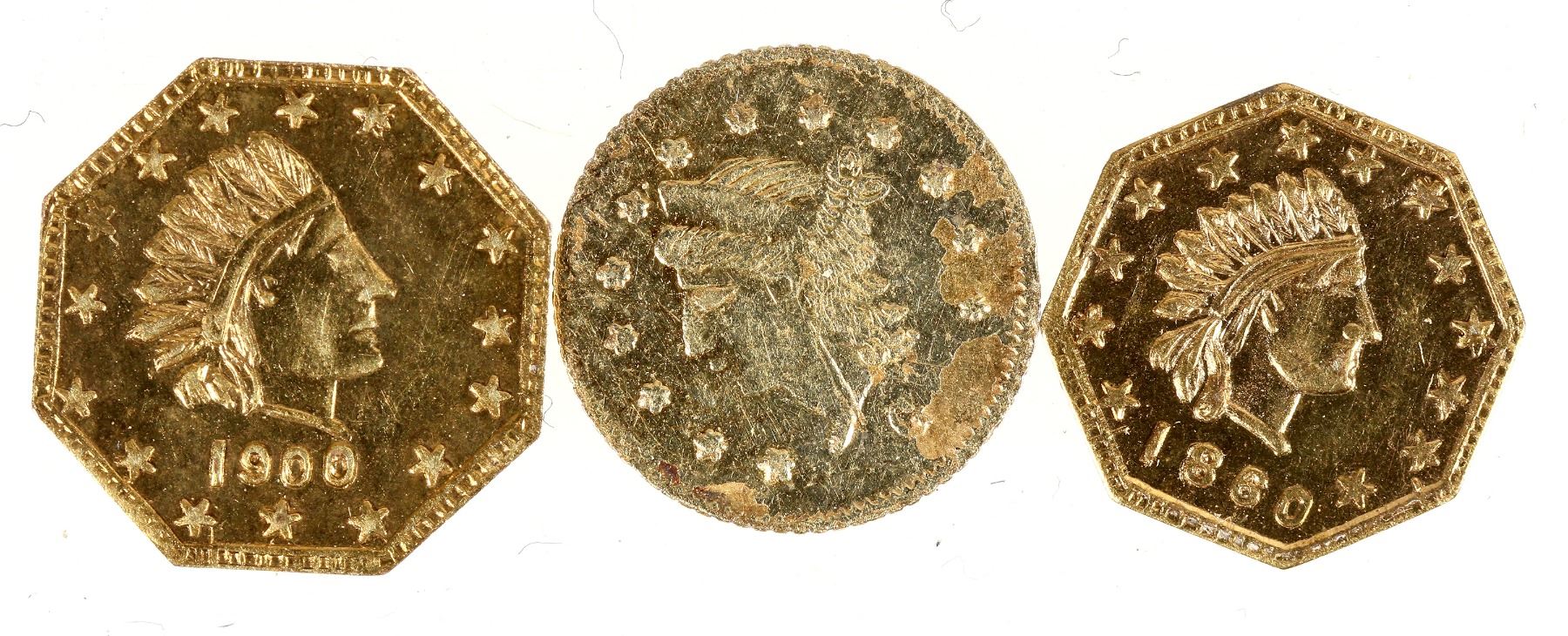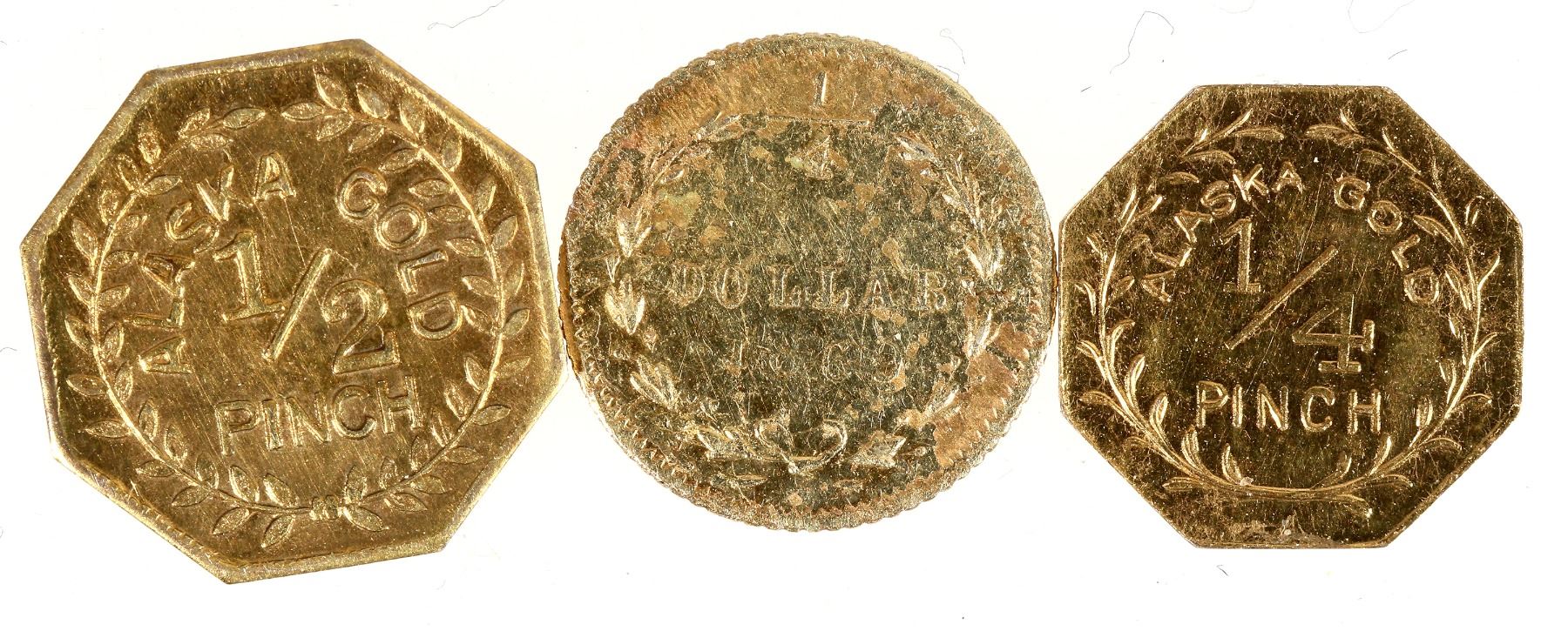 Three fractional gold tokens: 1) 1900 Alaska Gold / 1/2 Pinch; octagonal, 10 mm; 0.6 grams; BU condition. 2) 1869 1/4 dollar, "G"; 9 mm; 0.2 grams; AU-BU condition. 3) 1860 Indian head, Alaska Gold, 1/4 pinch; octagonal, 9 mm, 0.3 grams, AU-BU.