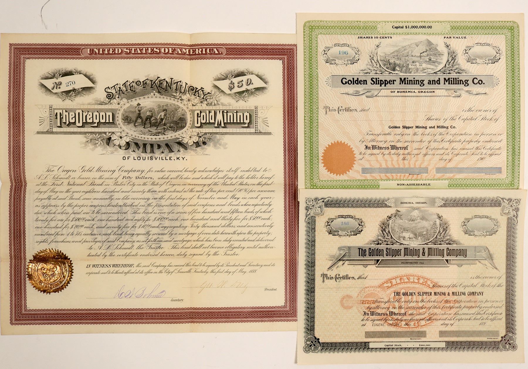 1) Unissued Golden Slipper Mining & Milling. Of Bohemia, Oregon. # 196. 2) Same as one. Dateline Eugene. # 186. Both are unissued and both in Excellent condition - like new. 3) Oregon Gold Mining Company bond. 1888. Bright gold seal. Coupons 5-10 still attached. Very nice condition with no condition issues except folds. Ken Prag Collection