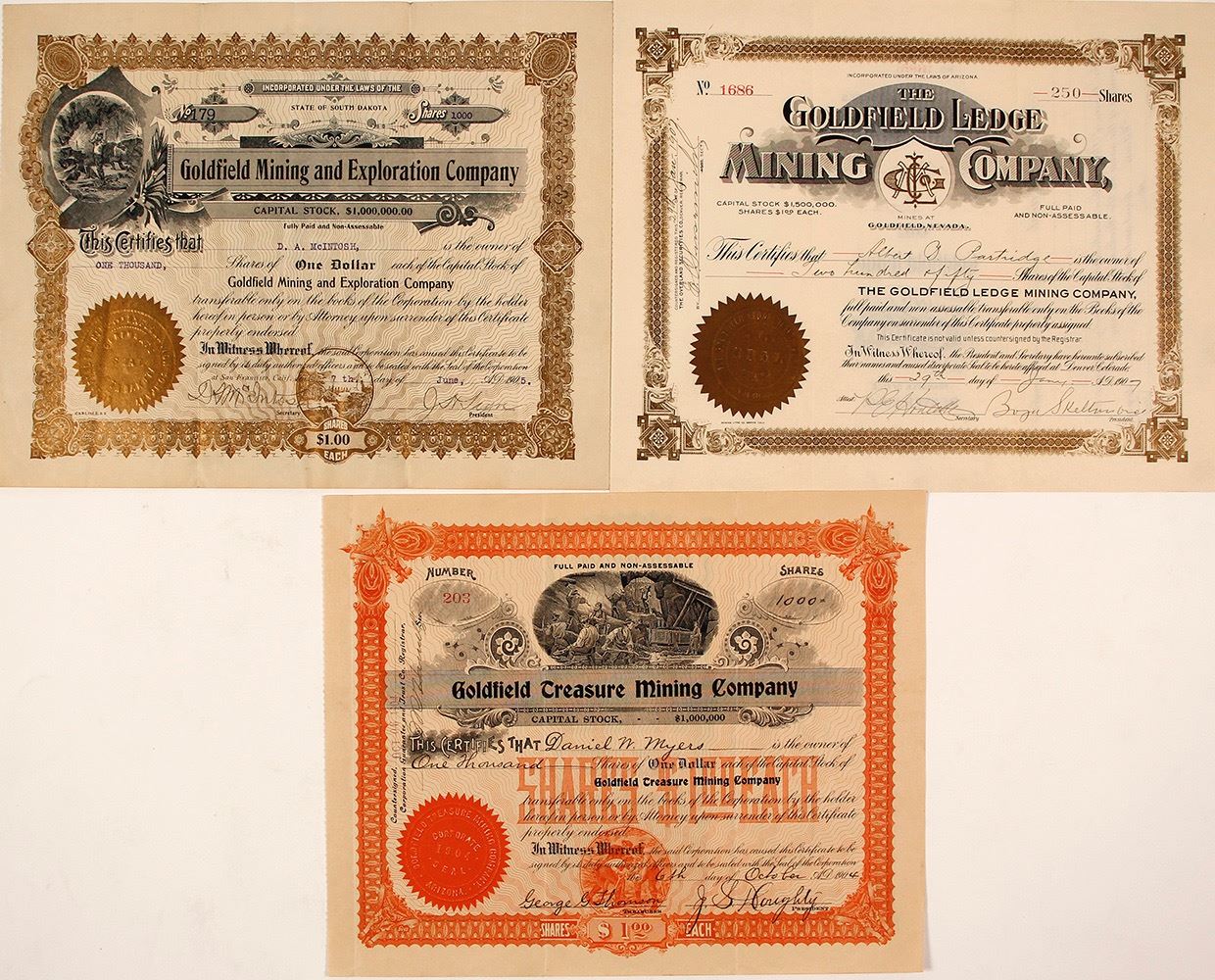 1) Goldfield Treasure. Number 203 for 1000 shares to Daniel Myers. Signed by George G Thomson and JS (?). Underground mining vignette with miners and an ore car. Two heavy vertical folds. Very nice condition. 2) Goldfield Ledge Mining Company. Number 1686 for 250 shares to Albert Partridge. Signed by Houlette and Skelton. Very crisp and clear. Two vertical folds. 3) Goldfield Mining and Exploration Company. Number 179 for 1000 shares to DA McIntosh. Signed by DA McIntosh and JH Layne(?). One wrinkle and two heavy vertical folds.Overall quite choice certificates. (Bennett Collection) Date: 1904-1907 Location: Goldfield, Nevada HWAC# 59851