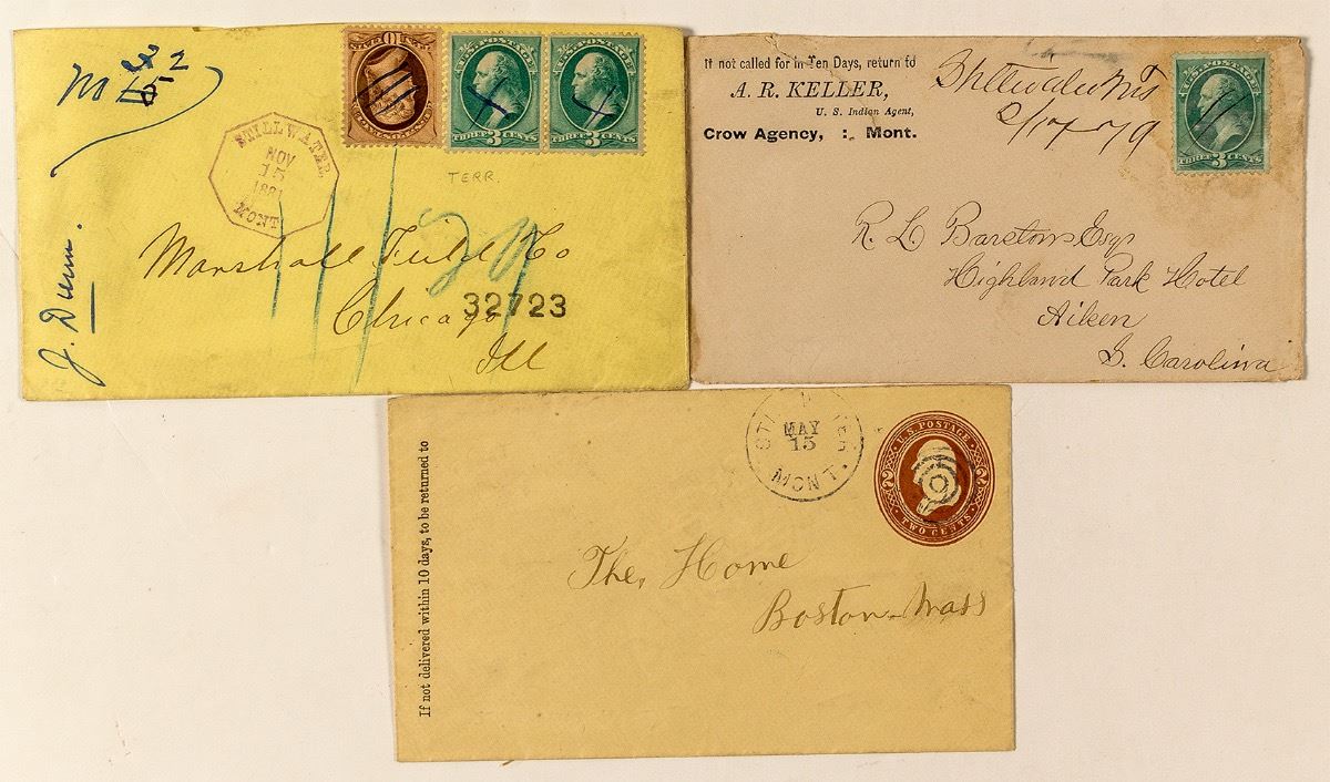 1) Type one manuscript. Large corner cover for A. R. Keller, U. S. Indian Agent, Crow Agency, Mont. 2) Type 2 magenta octagon. 1881. 3) Type 3. c 1887. City: Stillwater State: Montana Date: 1879-c1887 ID: 37053