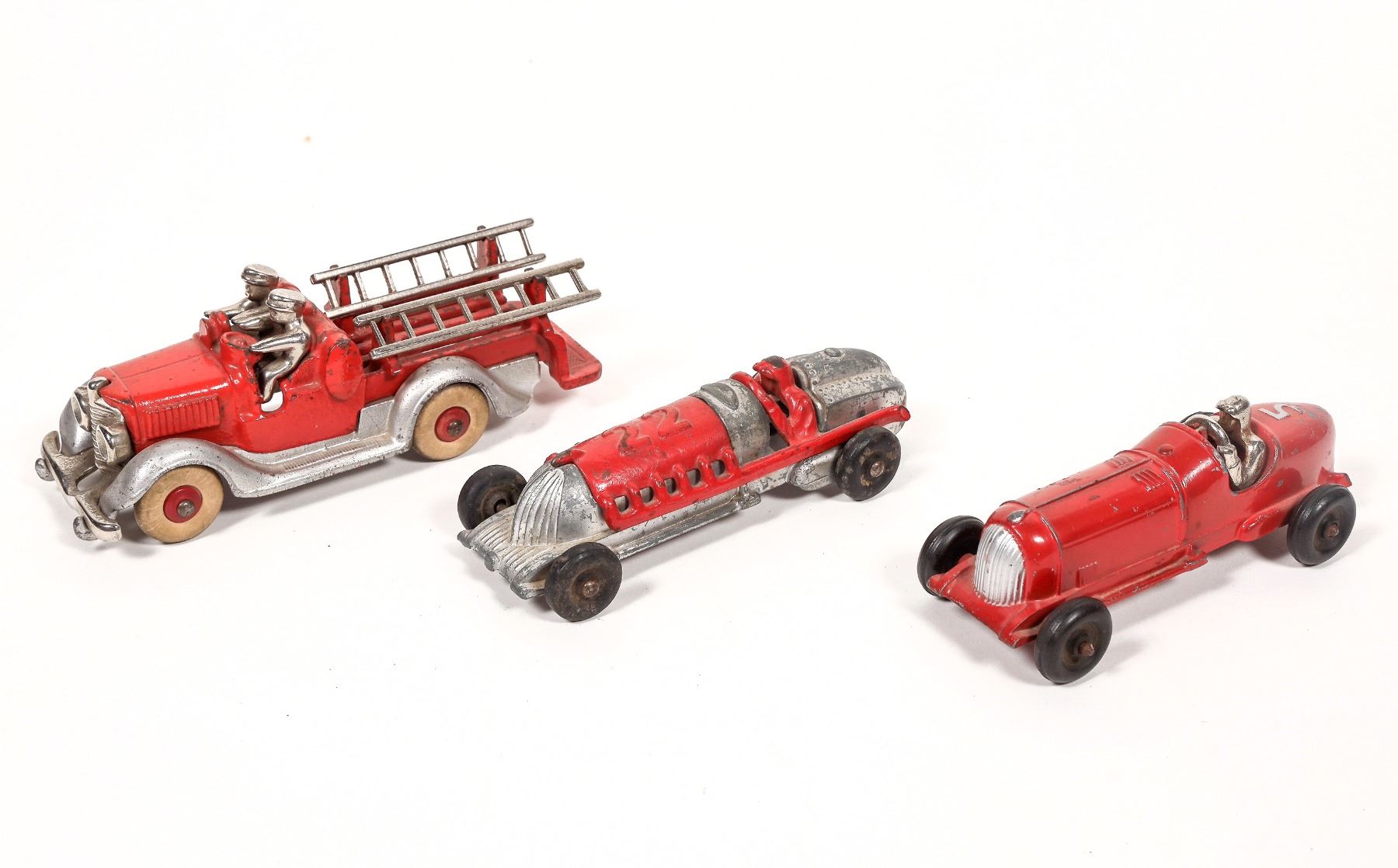 2. Hubley #22 race car. Red and silver paint w/some wear. Black tires. In overall good condition. No rust or cracks.