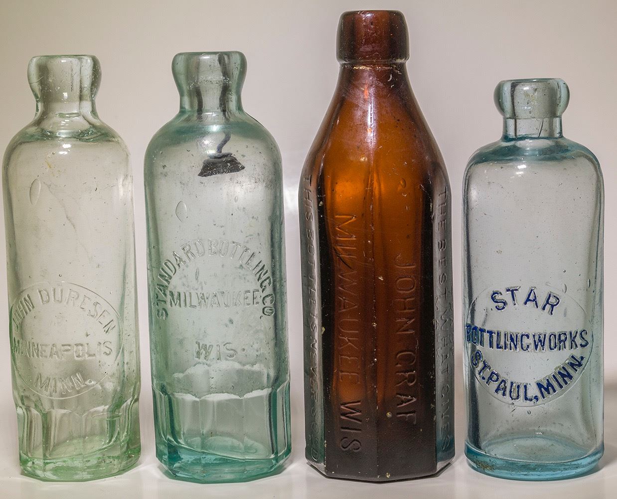 Three Hutch soda bottles and a tall amber soda. Star from St. Paul, aqua mint. Duresen (1896-1908, see Feldhouse) from Minneapolis, aqua. Standard from Milwaukee, aqua. John Graf, "The Best What Gives", Milwaukee, eight sided Amber tall soda with case wear. HWAC# 47040 Date: Location: Wisconsin/Minnesota