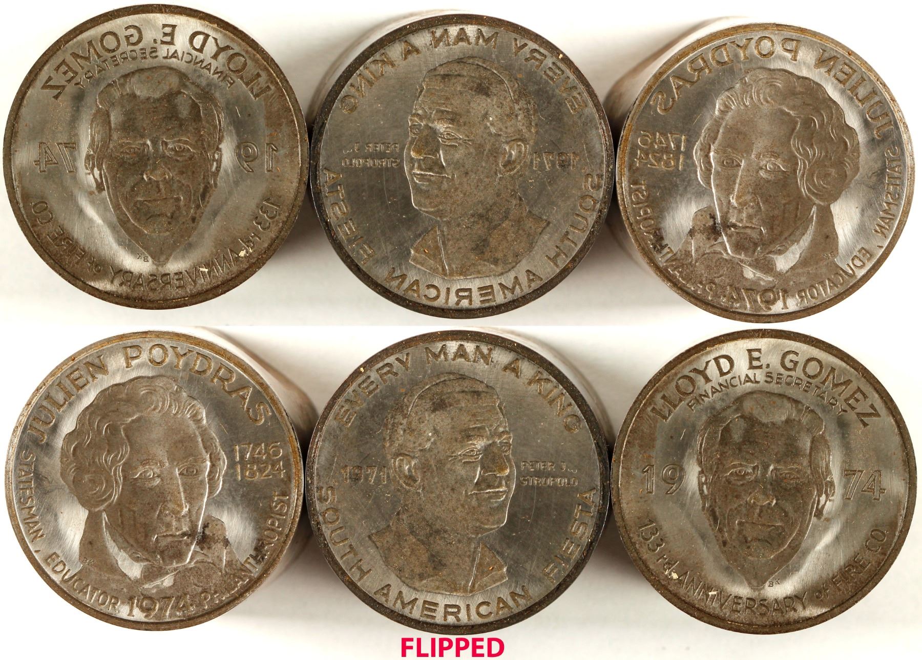 Julien Poydras, 1746-1824; 1974 commemorative medal for being an "educator, statesman and philanthropist;" design of Poydras. Peter J. Stropolo, 1971; "Every Man A King," "South American Fiesta;" design of Stropolo. Lloyd E. Gomez, Financial Secretary, 1974; design of Gomez. All 1.5" in diameter. NWT Mint Historical Die Collection.