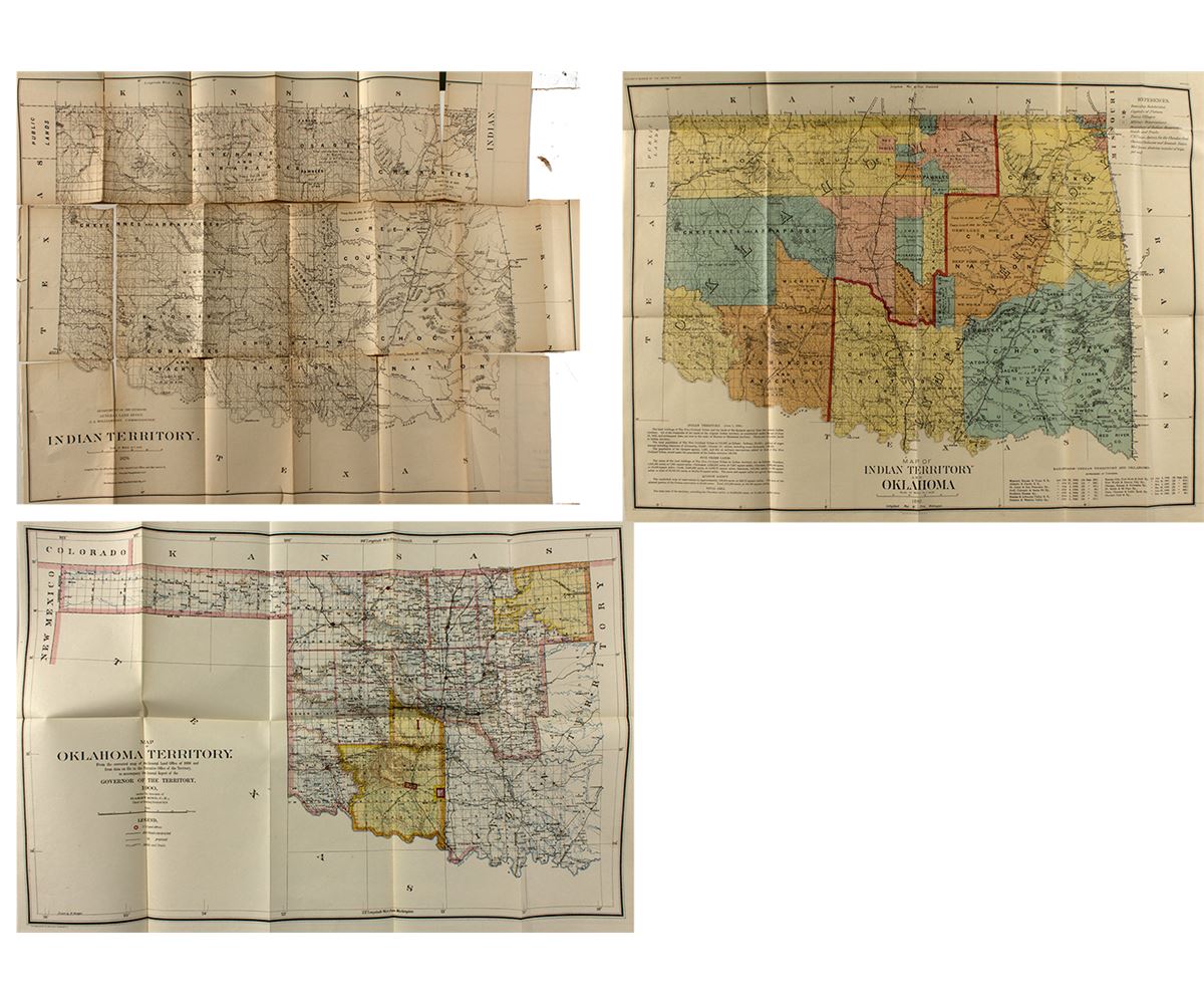 1) Map of Indian Territory and Oklahoma, 1890. Railroads, Indian Territory and Oklahoma. Authorized by Congress. The Territory of Oklahoma was an organized incorporated territory of the United States that existed from May 2, 1890, until November 16, 1907, when it was joined with the Indian Territory under a new constitution and admitted to the Union as the State of Oklahoma. The 1890 Oklahoma organic act organized the eastern half of Indian Territory and a strip of country known as No Man's Land into Oklahoma Territory. Reservations in the new territory were then opened to settlement in land runs later that year and in 1891 and 1893. (24" x 31") 2) Department of Interior General Land Office, J. A. Williamson, Commissioner. Map of Indian Territory, compiled by C.l Roeser, 1876. ( 27" x 33") Nice map, but torn at all folds, very delicate. 3) Map of Oklahoma Territory. From the corrected Map of the General Land Office of 1898 and from data on file in the Executive Office of the Territory, to accompany The Annual Report of the Governor of the Territory, 1900. Under the direction of Harry King, C. E. Chief of Drafting Division. (16" x 23") Beautiful map in great condition.