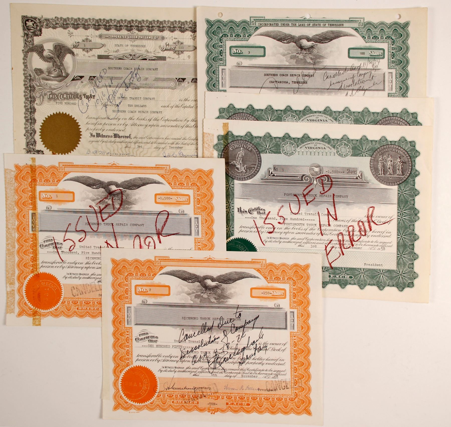 Lot of six. 1-2) Portsmouth Truck Repair Company. Number one issued in error. Number two cancelled when the company dissolved. 3-4) Richmond Truck Repair Company. Number 1 issued in error. Number two cancelled when the company dissolved. 5-6) Southern Coach Repair Company. Number one cancelled. Number 3 cancelled when the company was dissolved. All 1958. All in very good condition. They all seem to come from the same umbrella company. What an interesting group! Prag Collection