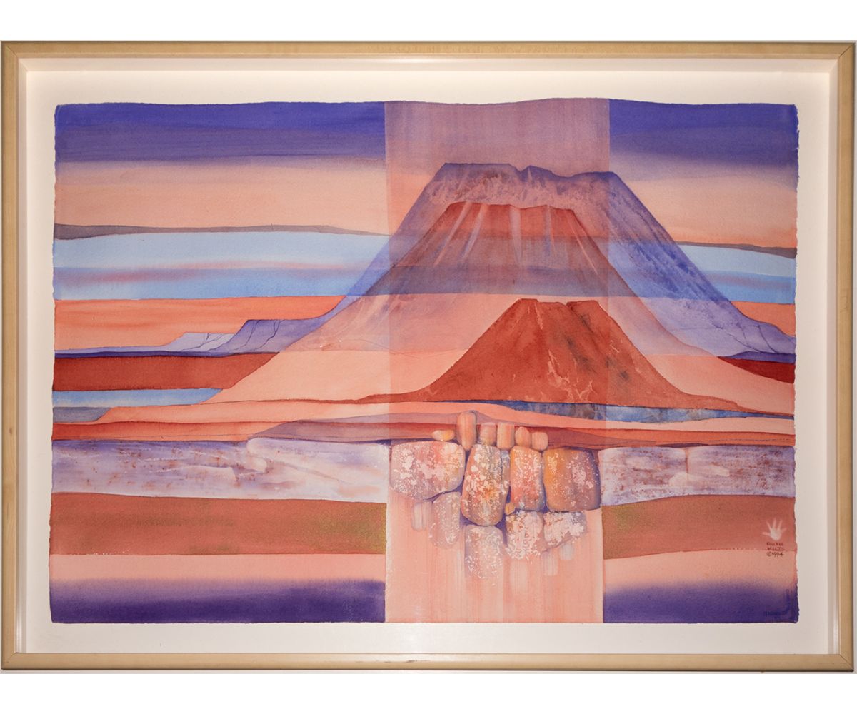 Watercolor and gesso landscape painting by Ruth Hilts. (Framed: 26" H x 34" W). The painting, primarily bands of complimentary colors—oranges and violets, depicts three mesas overlapping each other.