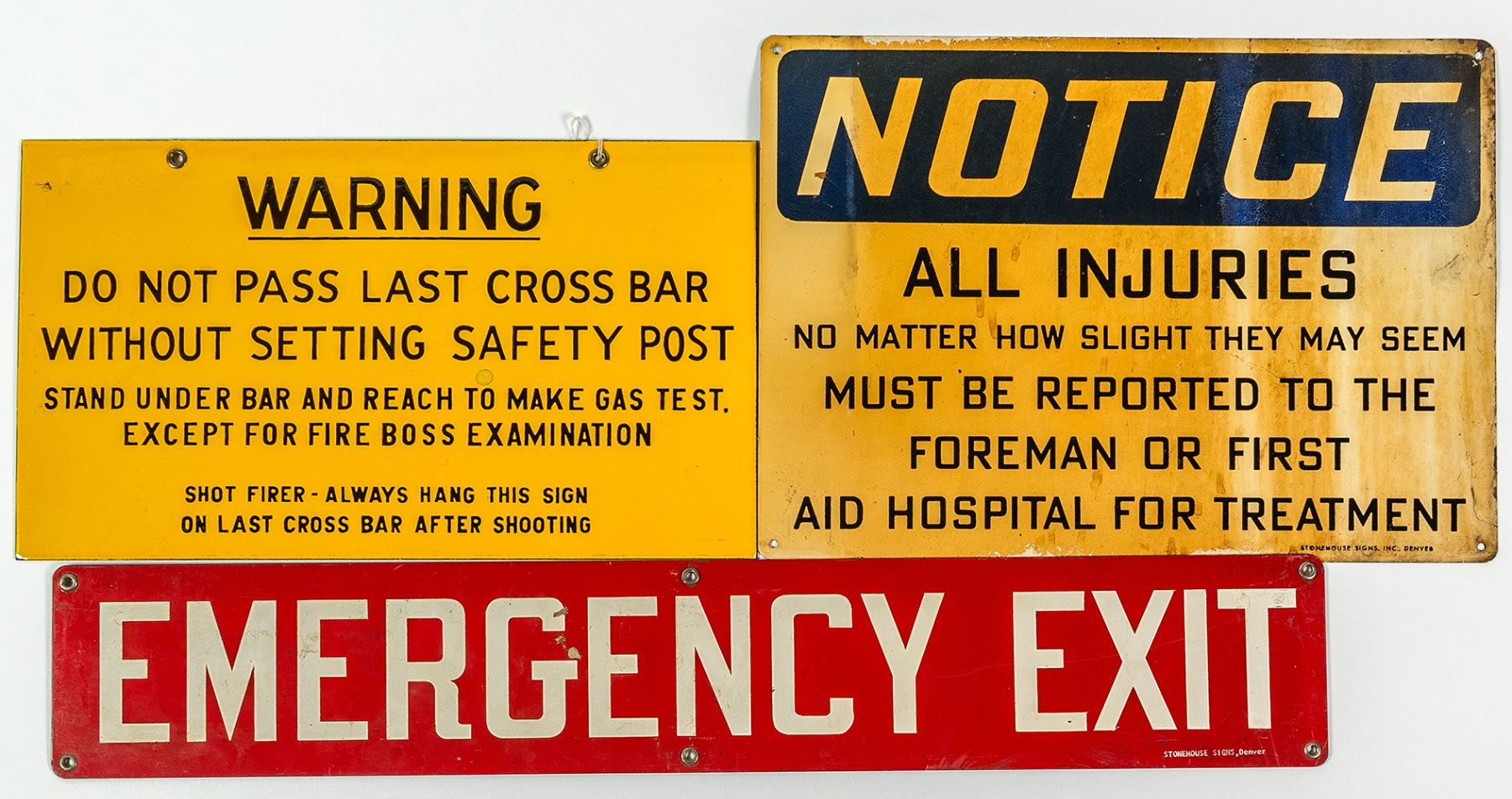 A) "All injuries must be reported" by Stonehouse Signs Denver, 10 x 14". B) "Do not pass left crossbar." Black on yellow 8 x 14" enamel. 3) "Emergency exit" by Stonehouse Signs, 4 x 24". Red and white on metal. No location data. Date: Location: HWAC # 43948