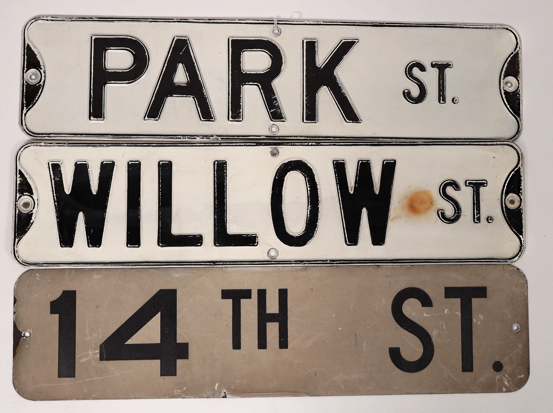 Group of three metal street signs. The signs are white with black letters. They are for three different streets, Park St., Willow St., and 14th St. Signs are about 23.75 x 5.75. Good condition, slightly scratched.