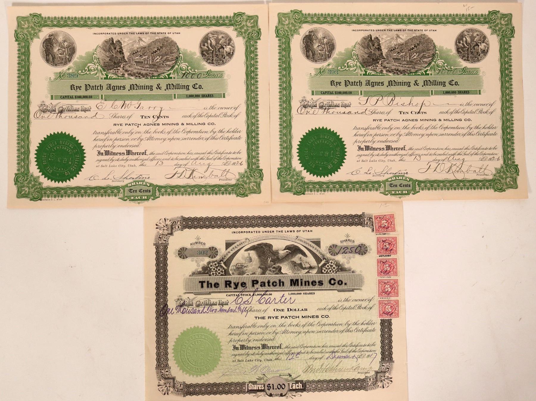 Three stock certificates from Rye Patch, Nevada. 1) The Rye Patch Mines Co., issued in 1917. Eagle vignette with five revenue stamps along the top right border. Unc. 2-3) Two certificates from Rye Patch Agnes Mining and Milling Co., certs. 389 and 393. Both issued in 1926. Three mng. vignettes. Unc.