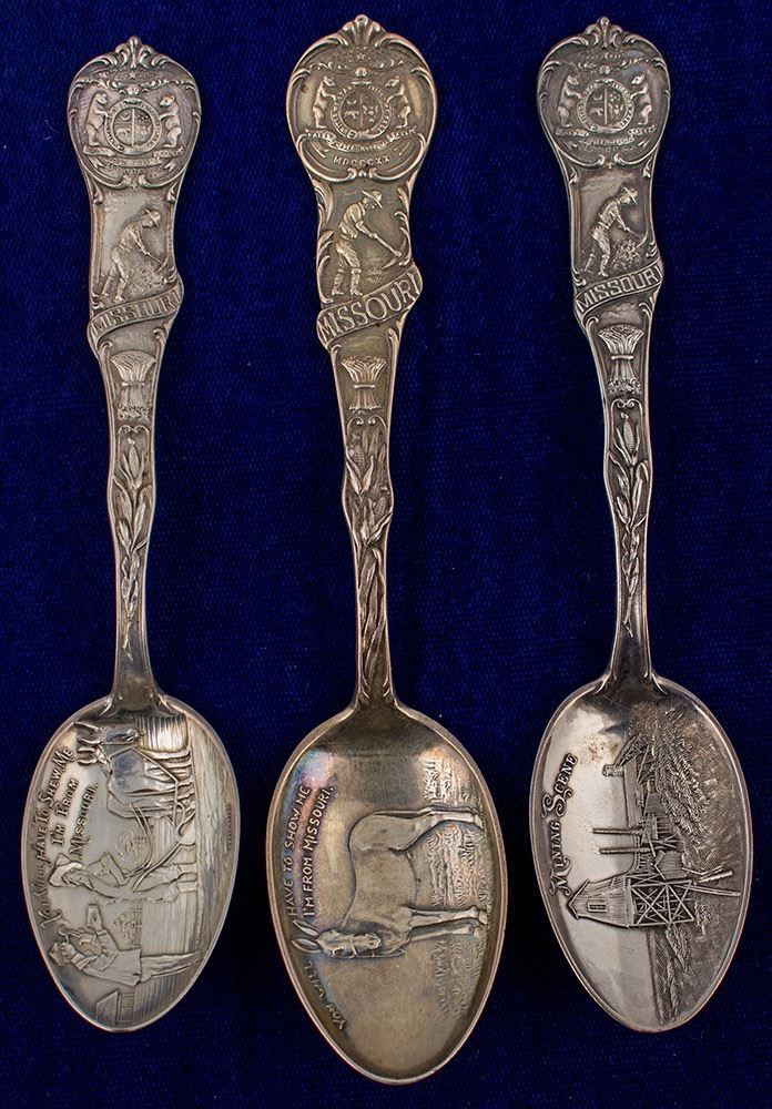 1) Die struck, " You will Have to Shew Me I'm From Missouri" image of 2 men and burros; 2) Die struck "Mining Scene" and image; 3) die struck " You Will Have To Show Me. I'm From Missouri, image of burro. All have similar handles. State: Missouri City: HWAC#: 37824 Date: