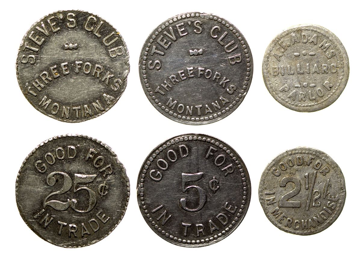 1) A. F. Adams / Billiard / Parlor // GF / 2-1/2c / In Merchandise. Round, aluminum, 18mm. 2) Steve's Club / Three Forks / Montana // GF / 5c / IT. Round, aluminum, 24mm. 3) Steve's Club / Three Forks / Montana // GF / 25c / IT. Round, aluminum (outside edge trimmed off), 24mm. (Svoboda Collection) City: Three Forks State: Montana Date: HWAC# 35852