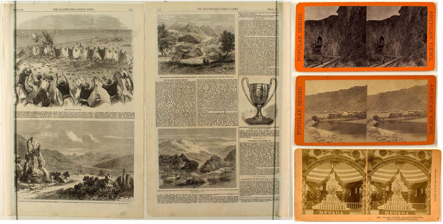1) Three rare Nevada stereoviews. 1) CPRR, Palisade-Humboldt Canon, published by E. & H. T. Anthony & Co., 7686. 2) CPRR, Maggies Bower and Palisade Bluff, published by E. & H. T. Anthony & Co., 7104. 3) Stereoview of Nevada's Exhibit, Agricultural Building, World's Columbian Exposition. Photographed and published by B. W. Kilburn, Littleton, N. H. 2) London Newspaper with Comstock Mining Illustrations. Newspaper has three illustrations (great engravings) of "The Washoe Silver Region (Virginia City), Nevada and an accompanying article about the recently organized Territory of Nevada. The engravings are: Devil's Gate, Gold Hill, Mount Davidson and the Ophir road, and Virginia City. Date: Location: Nevada HWAC# 42105