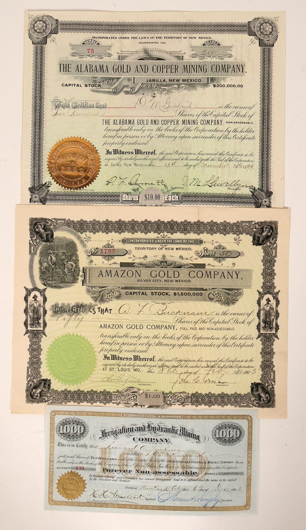 1) Irrigation and Hydraulic Mining Company. # 130 for 1000 shares in 1892 to Leonard Jenkins. Black on blue paper with gold border, imprinted gold seal and gold underprint '1,000'. Very fancy green reverse. No edge, pin hole, corner or discoloration issues. 2) Alabama Gold and Copper Mining Company. # 75 for 200 shares in 1899. Issued to DM Goodrich and signed by president Llewellyn. Jarilla, New Mexico. Black on green safety paper. Bright gold seal. Red reverse. Heavy folds, but no edge, corner, pin hole or discoloration issues. 3) Amazon Gold Company stock # 1783 for 50 shares to AF Buckman in 1905. Seven smaller mining vignettes. Green imprinted seal. Small tears at fold edges. Pin holes. Still nice. 1905. Ken Prag Collection