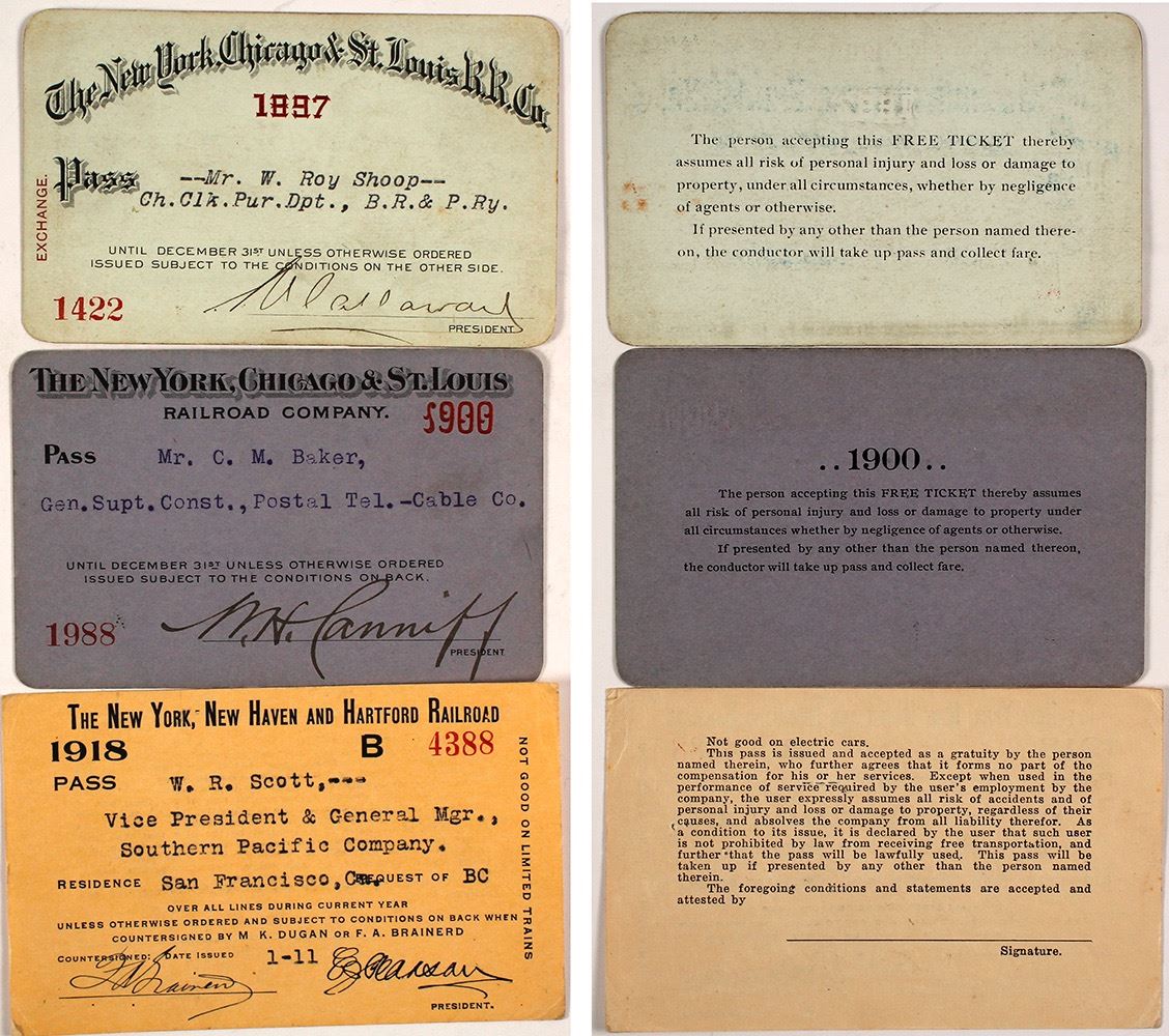 1) Two different for The New York, Chicago & St. Louis Railroad Company. Issued in 1897 and 1900, signed by different presidents. Green and purple cardstock. Some toning/soiling. 2) A 1918 pass for The New York, New Haven and Hartford Railroad. Issued to WR Scott VP of Souther Pacific. (Potter Collection) Date: 1897-1918 Location: New York HWAC# 60369
