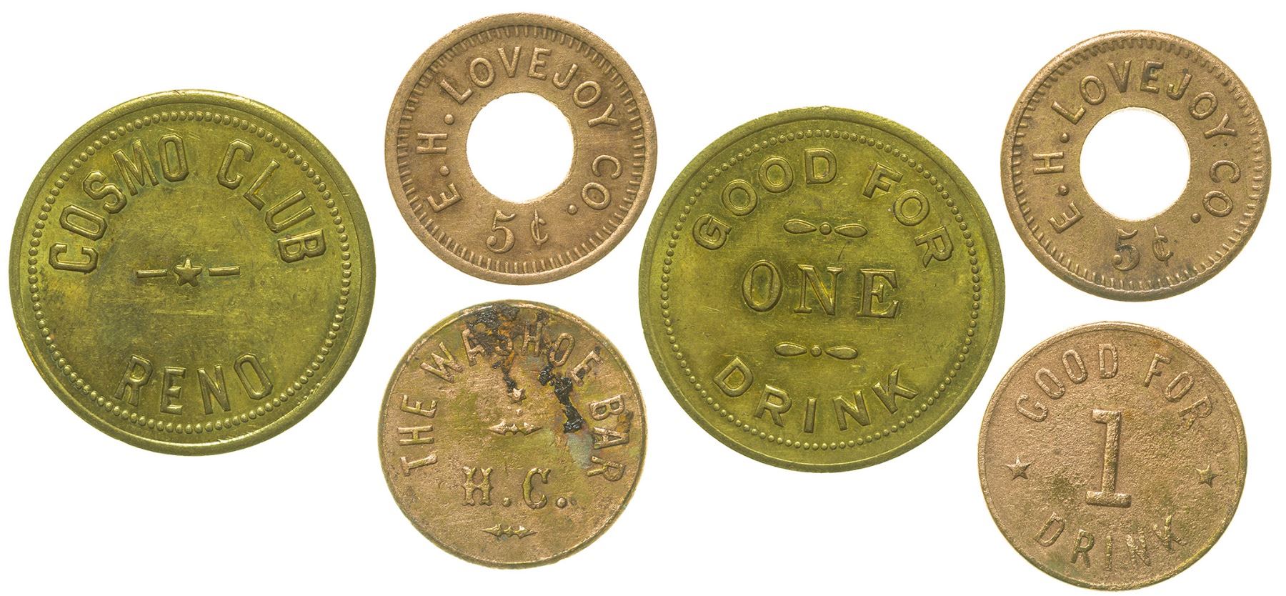 Lot of three: 1) E.H. Lovejoy Co. . 5c; Rev.: same; rd., holed, 21mm; 2) Obv.: Cosmo Club / Reno; rev.: Good For / One / Drink; Br., rd., 29mm; 3) Obv.: The Washoe Bar / H. C.; Rev.: Good For / 1 / Drink; rd., 22mm. HWAC# 53856 Date: Location: Nevada