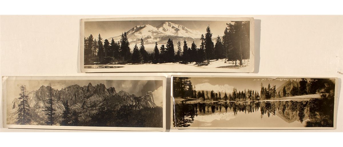 Three different panorama RPPC of Mt. Shasta. No photographer identified. Each is 3.5" x 11." View of Mt. Shasta and Black Butte from Abrams Lake, view of snow-covered Mt. Shasta, and view of Castle Crags. All three have deep creases on the right edge and minor wear elsewhere. Very attractive views.