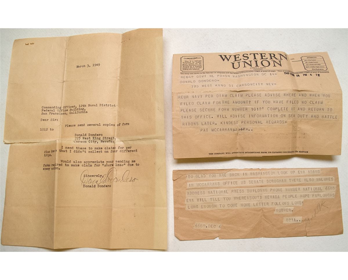 All pertaining to Don Dondero and his pursuit of disability from his service in the Navy. Letter is ripped at the middle fold.