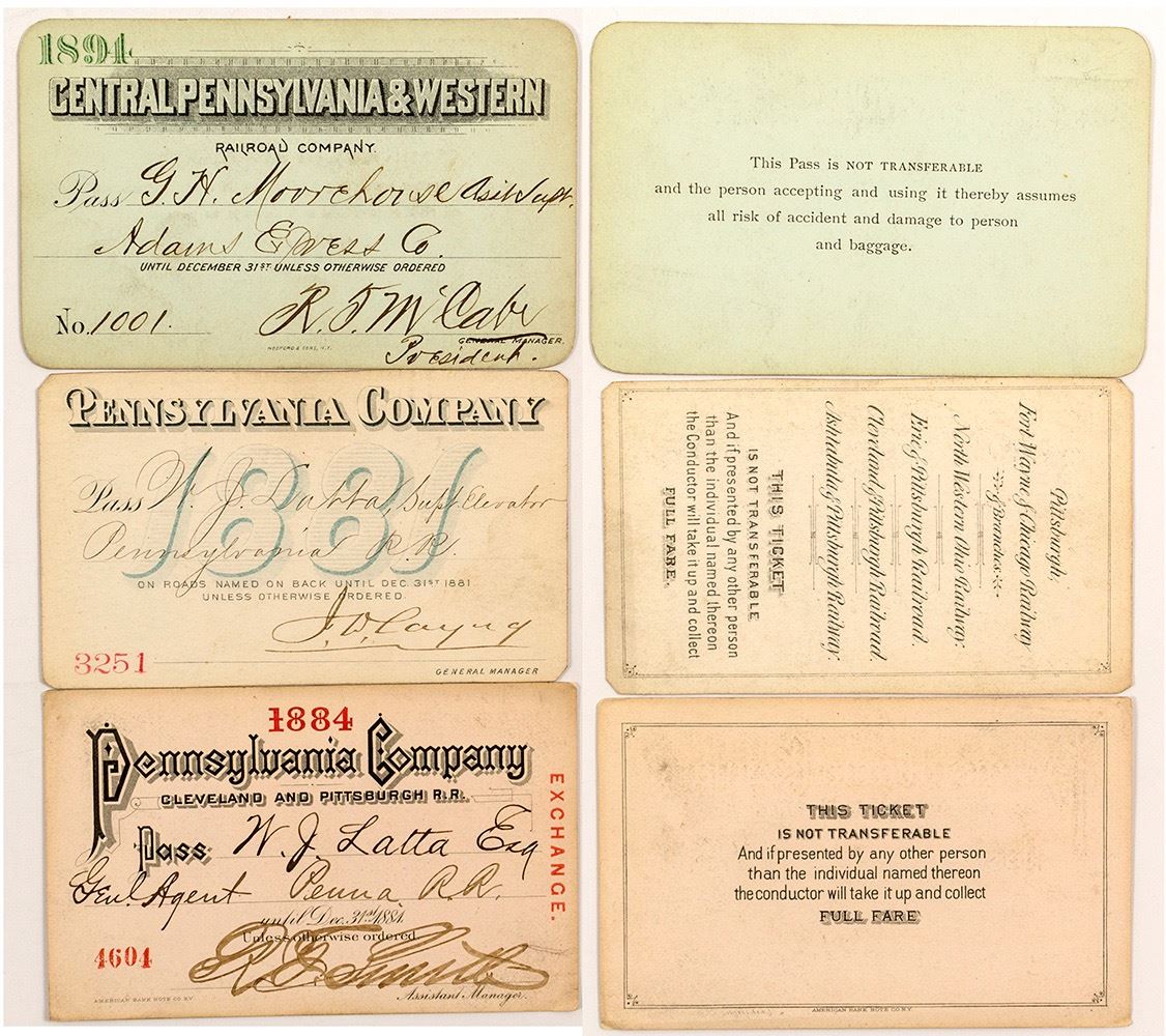 Lot of three. 1) 1881. To WJ Latta of the PRR. Signed by J Cayug(?) General manager. Back lists the Pittsburgh, Fort Wayne & Chicago Railway ind its four branches. 2) 1884. Issued to Latte. Signed by assistant manager R Smith. Stamped in red is "exchange". 3) 1894 Central Pennsylvania & Western. Issued to GH Moorehouse of the Adams Express Company. Signed by president RTM Cabe. Number 1001. All are in excellent condition. In 1902 it was renamed the Susquehanna, Bloomsburg, and Berwick. Date: Location: Pennsylvania HWAC # 53575