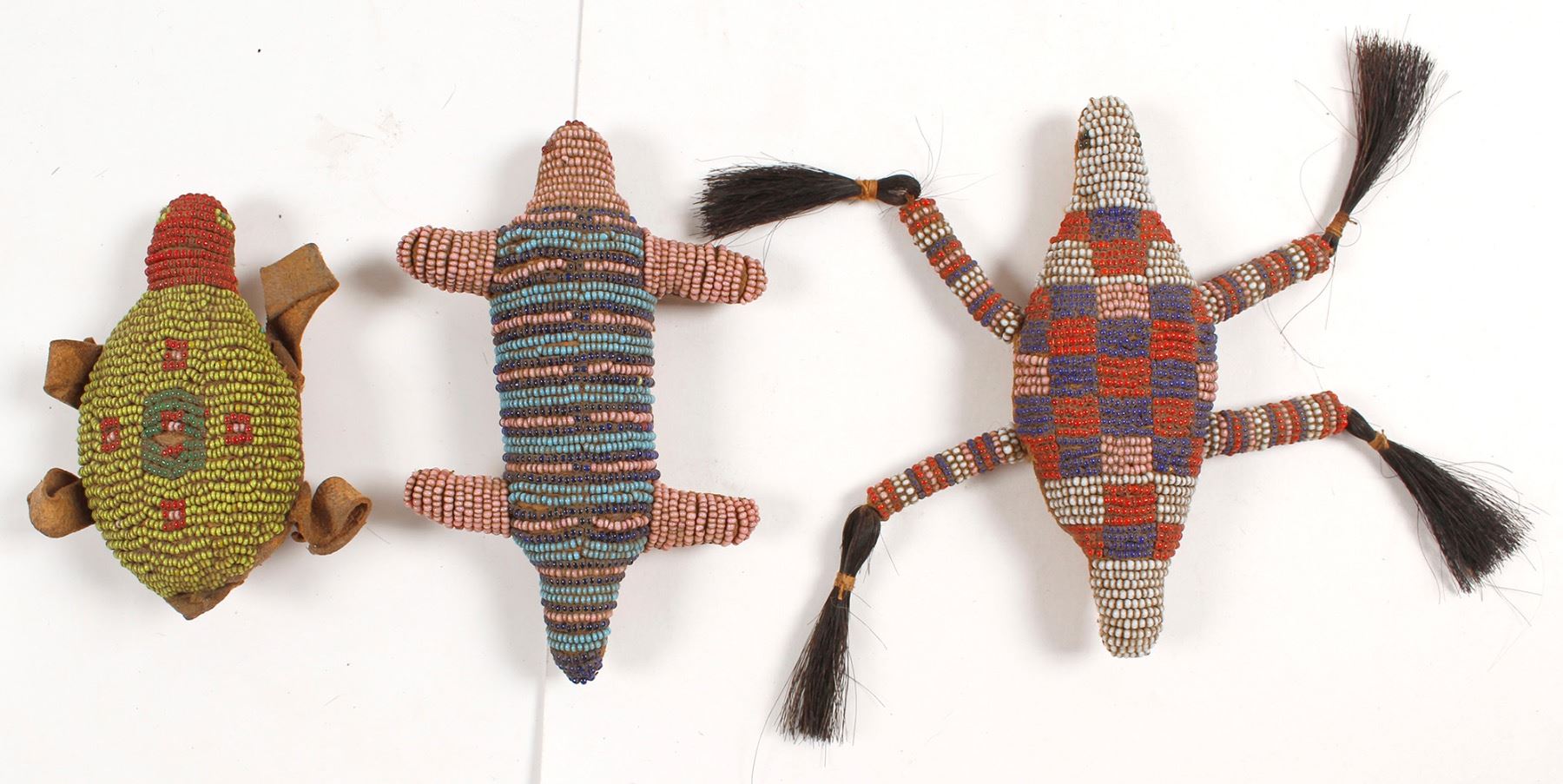 Three different animals--beaded top and leather underneath. Two lizards and one turtle. Unique, and charming. Date: 1950's Location: Northern Plains HWAC# 56811