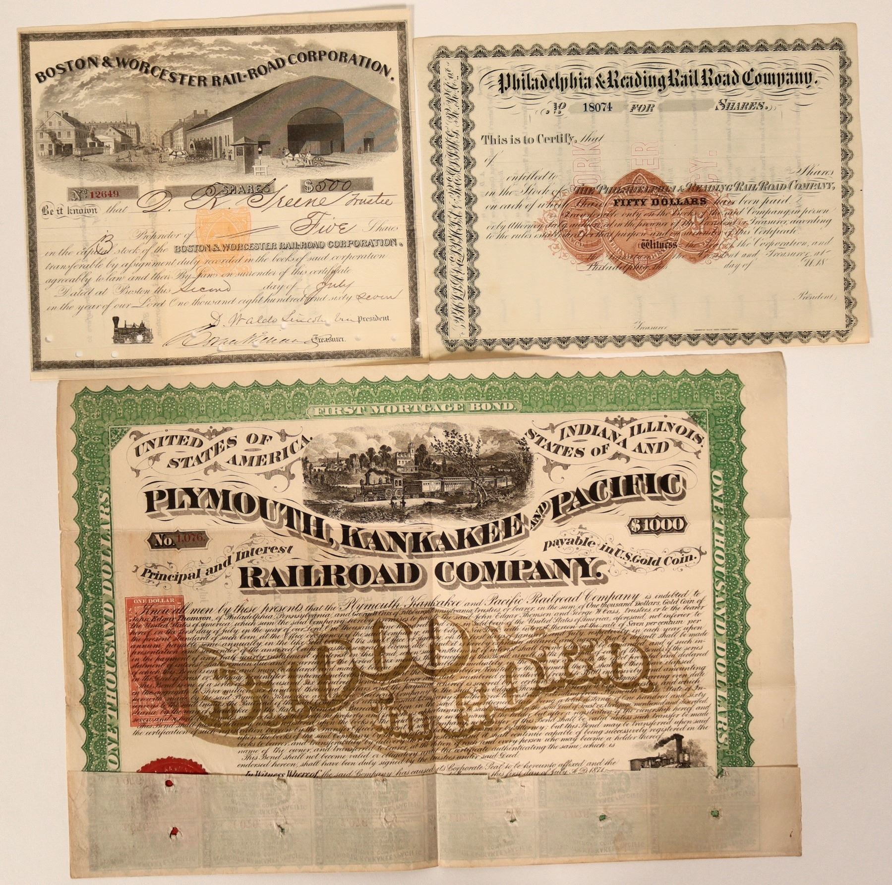 Lot of 3 different. 1) Boston & Worcester Rail-Road Corporation. Stock issued in 1867, punch cancelled. Fabulous vignette of industrial area of a city (Boston) that takes up almost half of the stock. RN-T4 revenue imprint. Rare. 2) Philadelphia & Reading Rail Road Company. Unissued stock. RN-U2 revenue imprint. 3) Plymouth, Kankakee & Pacific Railroad Company. $1,000 bond. Issued in 1871, punch cancelled. Green border, red seal, and two locomotive vignettes. RN-W2 revenue imprint.