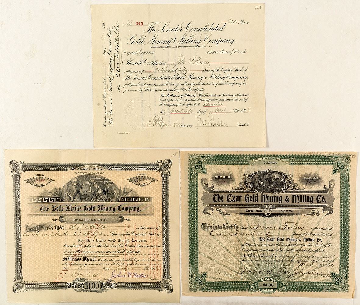 1) The Senator Consolidated Gold Mining & Milling Company. Inc. in Arizona. Denver dateline. No. 345, issued for 250 shares April 17th, 1893. Not cancelled. Deep folds. 2) The Belle Plaine Gold Mining Company. Inc. in Colorado. No. 1688, issued for 6,187 shares in July 1898. Not cancelled. Vignette of miners with headlamps. Folds. 3) The Czar Gold Mining & Milling Company. Inc. in Colorado. No. 368, issued for 100 shares March 1900. Not cancelled. Green border and mining vignette. Tape repairs along fold lines. (Prag Collection) City: State: Colorado Date: 1893-1900 ID# 34401