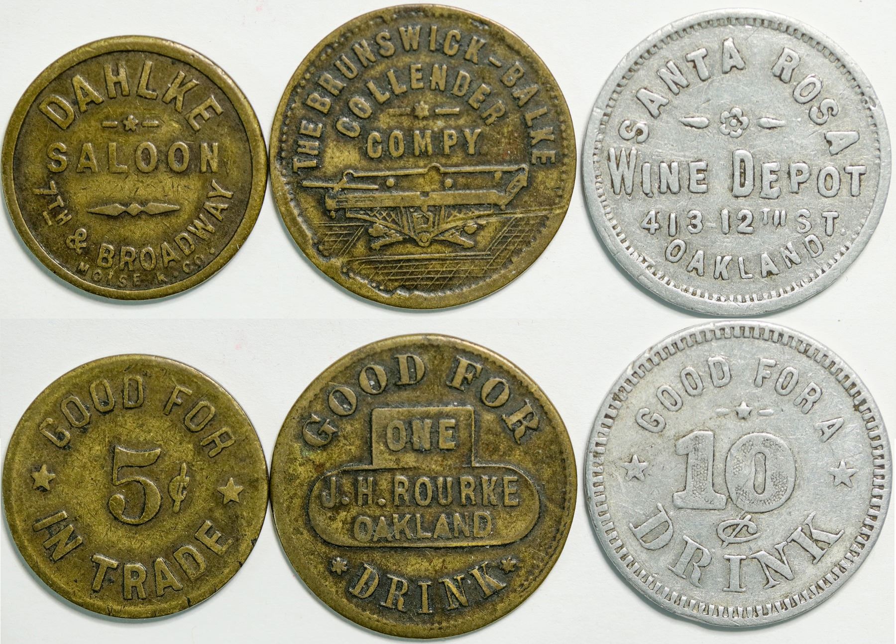 Lot of three: 1) Santa Rosa / Wine Depot / 413 12th St. / Oakland // Good For A / 10 / c / Drink; Rd., wm., 25 mm. 2) Dahlke / Saloon / 7th & Broadway // Good For / 5c / In Trade; Td., br., 21 mm. 3) Good For / One / J.H. Rourke / Oakland / Drink // The Brunswick-Balke / Collender / Compy / (pictorial pool table). Rd., br., 25 mm. Dahlke's was a bar on Broadway from 1904 to at least 1962. It was at the corner of Broadway and 7th across from the police station. The founder and namesake was August "Gus" Albert Dahlke (January 7, 1878 – September 2, 1943).