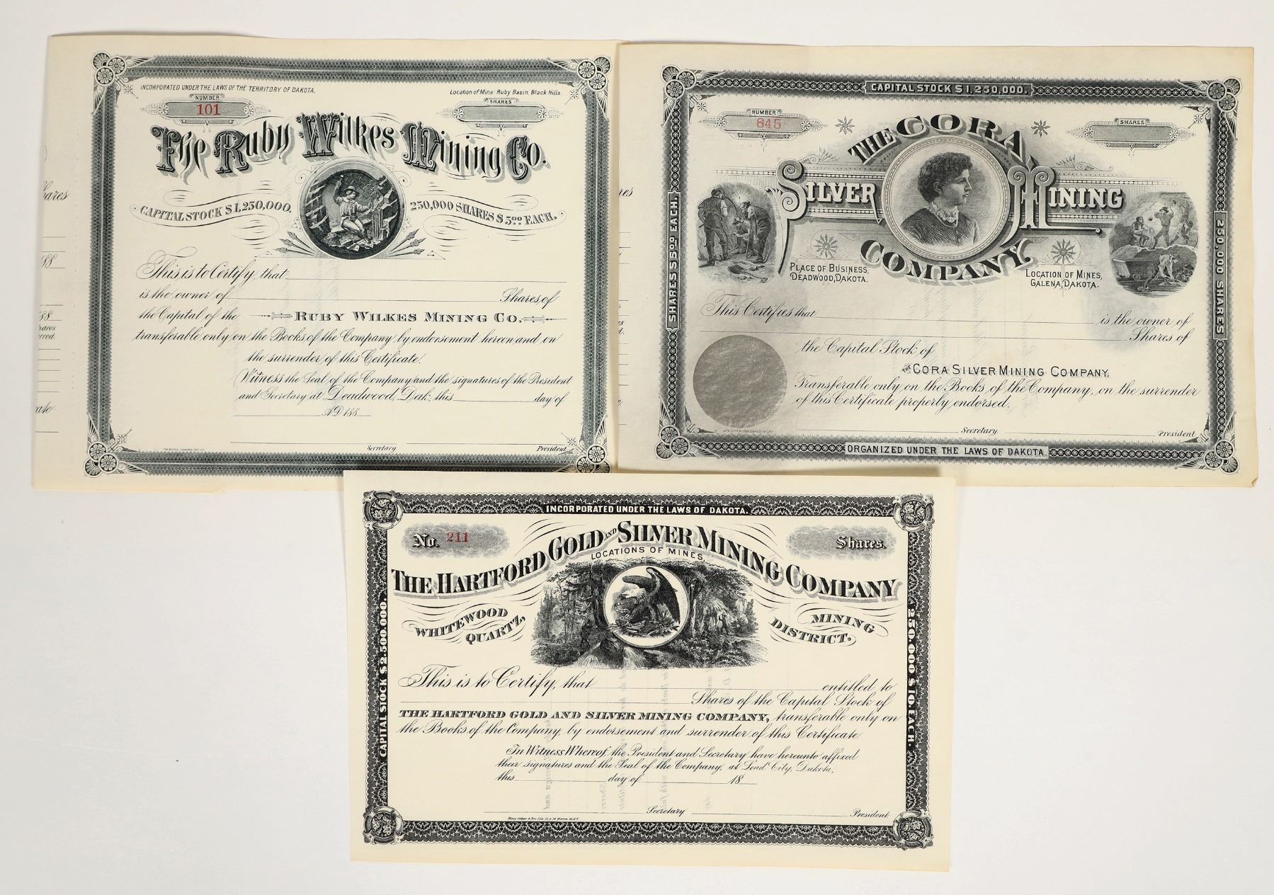 Lot of 3 different. Unissued, but rare. These may be the only examples you'll see. Includes: The Cora Silver Mining Company (Galena, Dakota); The Hartford Gold & Silver Mining Company (Whitewood Quartz Mining District); and The Ruby Wilkes Mining Company (Ruby Basin, Black Hills). Please inspect.