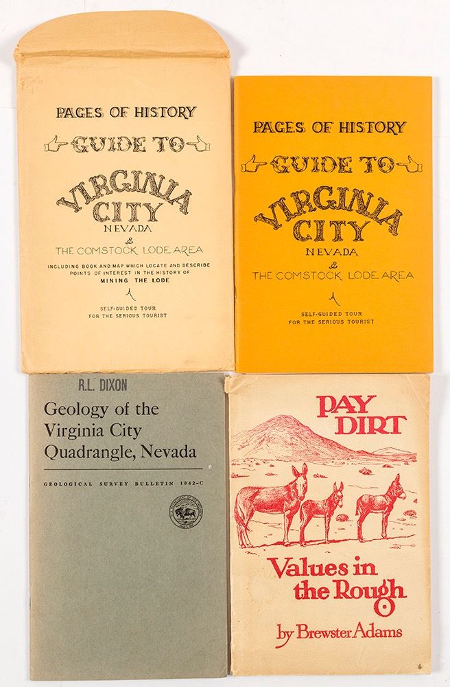 1) "Pages of History: Guide to Virginia City." Book and map for a self-guided tour. 1959. Map is 17 x 22". One very small tear at fold. Colorful and in excellent condition. Book is 55 pages and lists 48 stops complete with history. Many small diagrams throughout. In original envelope. 2) "Geology of the Virginia City Quadrangle, Nevada" Geological survey Bulletin 1042-C. 1956. Also includes a large map. Colored! 21 x 22". Immaculate condition. Booklet is 22 pages and also in excellent condition. 3) "Pay Dirt" by Brewster Adams. 1948. 58 pages. Date: Location: Virginia City, Nevada HWAC# 56916