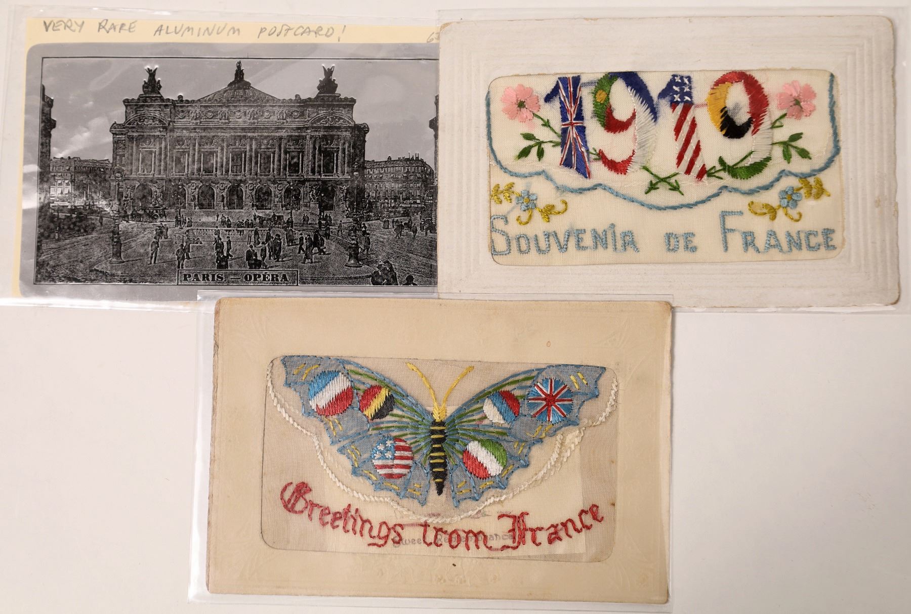 1) Rare Aluminum postcard of the Paris Opera House. 2-3) Two threaded postcards: "Souvenia de France" and "Greetings from France."